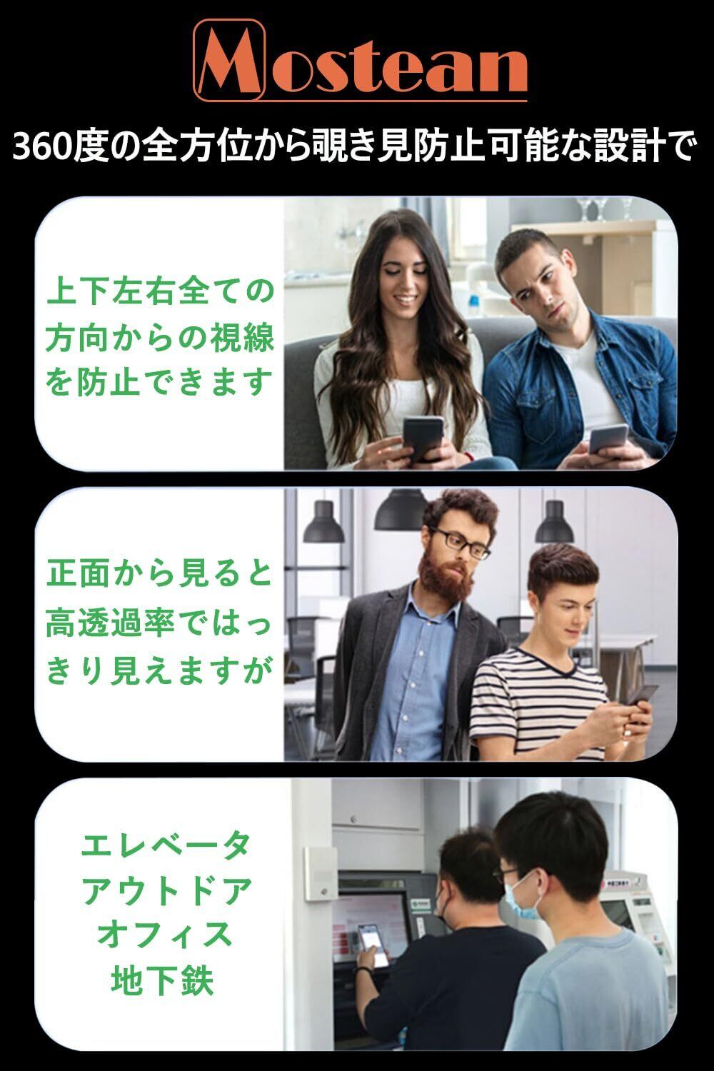 【360度 のぞき見防止機能】 縦持ち・横持ち両対応!どの角度からでも覗き見を防止します。最新鋭の偏光フィルター採用で操作性をキープしながらのぞき見を防止します。正面から見ると高透過率ではっきり見えますが、周りから見ると真っ黒で何も見られなくなり、満員電車やバスの中でもプライベートが守られて、ご安心ください!ご注意:のぞき見防止効果はiPhone画面の明るさによって変わります。