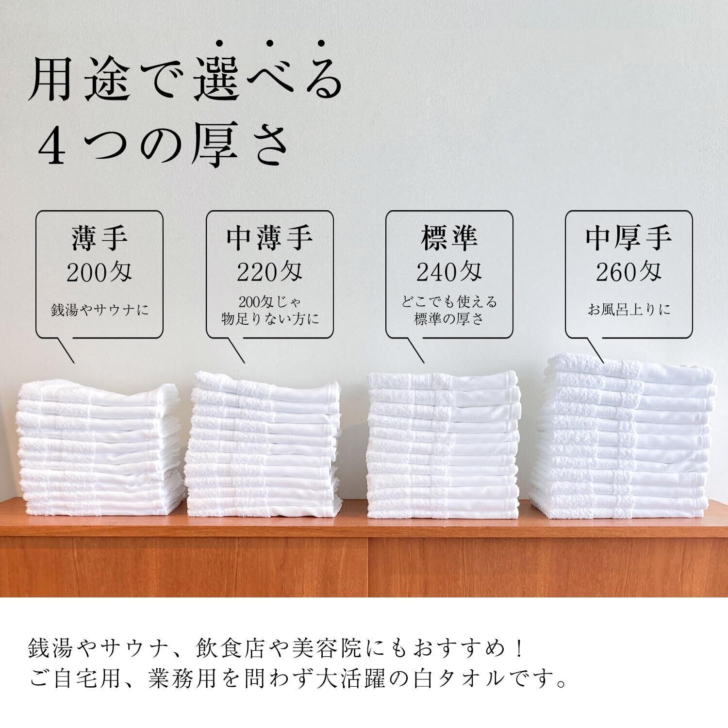【商品サイズ・重さ(1枚当たり)】<200匁>34×85cm 約62.5g <220匁>34×86cm 約68.5g、<240匁>34×88cm 約75g <260匁>34×94cm 約81g 【カラー】白 【素材】綿100% 【生産地】日本(泉州)