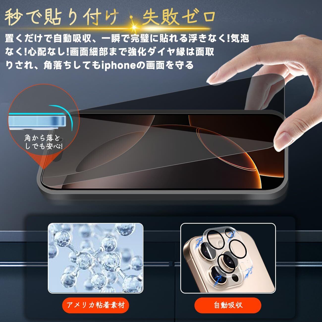 【専用設計·簡単に貼り付け】apple iphone16 Pro さらさら アイフォン16 Pro いpほね16Pro 専用液晶画面保護ガラスフィルム。本商品は日本素材のAGC 旭硝子 素材を採用して作られております。フィルムのシリコン自己吸着層により、スチールフィルムを携帯電話に合わせて軽く置くだけで、気泡が入らないように簡単に取り付けられます。(重点説明:フロントカメラのカメラ穴についてですが、ほこり・異物などの堆積を防止するため、ガラスフィルムにカメラ穴を開けていません。Seninhiのガラスフィルム 、通過率は99.9%なので、フロントカメラの正常使用に全く影響が出ません。)*モデルによっ
