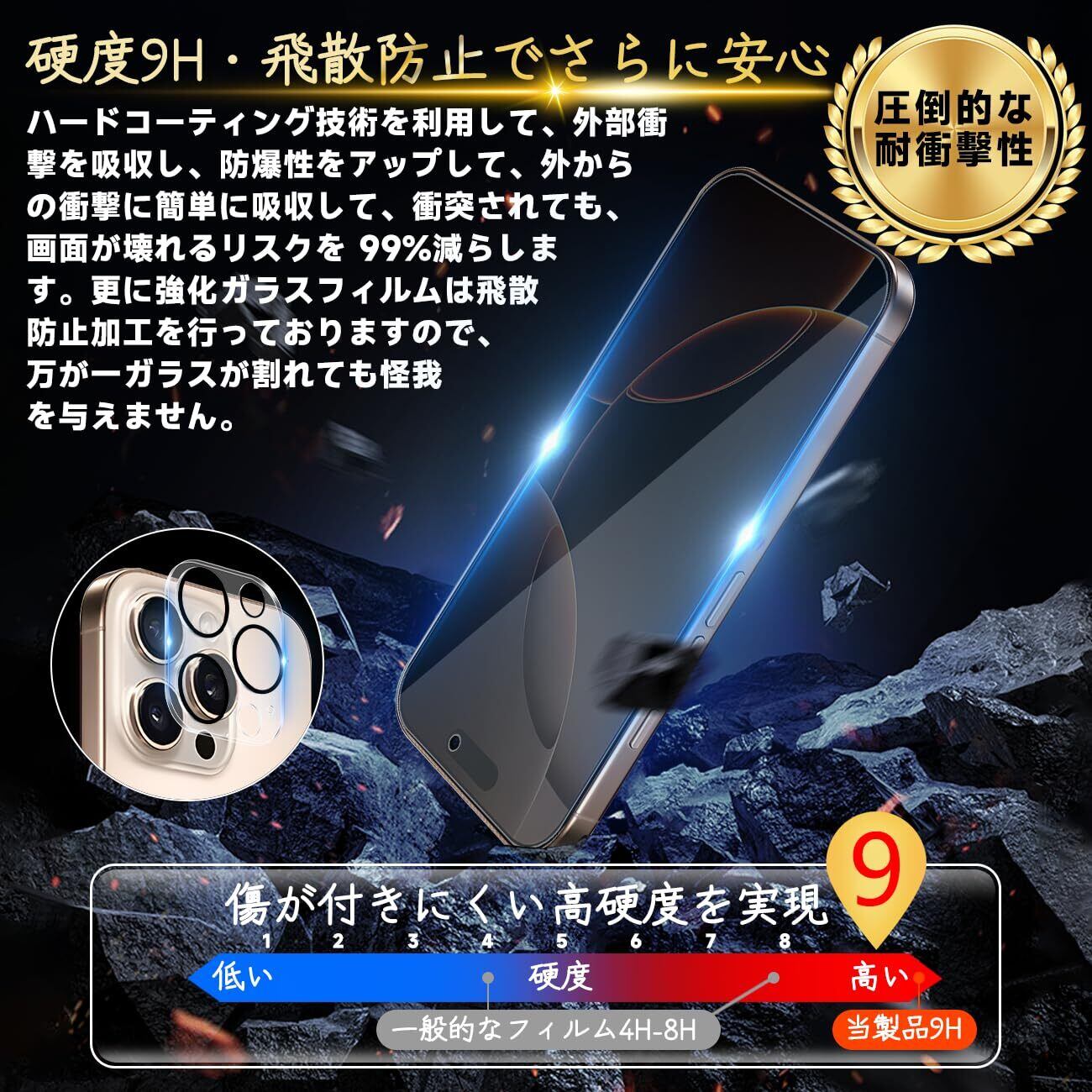 【高品質の材料の9H硬度】とレンズ保護フィルムはすべて旭硝子で作られており、スマホ保護フィルムの中で最高レベルの9H硬度に達しています、4.5時間以上の高温焼入れ処理を行い、スクリーンプロテクターの圧強度は 125mpa に達し、通常 ガラス の 5 倍になりました。しかもスクリーンプロテクターは衝撃を抑えるシリコンコーティングを内蔵しており、万が一ガラスが割れても、ガラスの破片が飛散しません。ハードコーティング技術は、衝撃を最小限に抑えて画面の破損を抑え、すり傷防止や指紋防止もしっかりとスクリーンを保護します。*大切な携帯電話の液晶画面を保護し、衝撃や表面のキズを防止します。