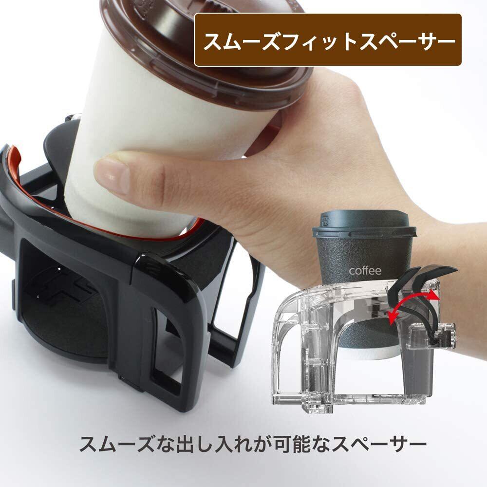 【スポッと収まるホールド感】コンビニコーヒーに多いカップタイプのドリンク容器をスムーズに誘い込むフラップ形状にすることで、運転中でもドリンク容器を入れやすくなりました。また、ドリンク容器と接触する保持部品を摩擦力の少ない材質にしているので、ドリンク容器を取り出す際に取り出しにくくなることがありません。すべり止め加工をしているカップタイプのドリンク容器でも出し入れがスムーズにできます。