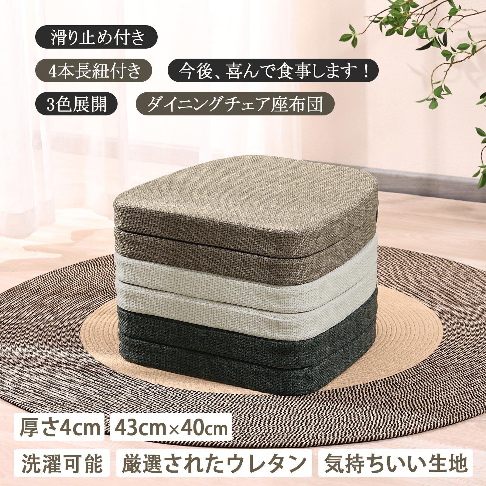 【座布団のサイズと圧縮包装】サイズ:約幅43×奥行40cm×厚み4cm(サイズの誤差は多少発生します。ご了承下さい)。重さ0.5kg;厚さは4cmで、チェアクッションとしても机との高さが合いやすく、テレワーク中の腰痛軽減に良いです。包装が圧縮状態なので到着後はパンパンと叩きほぐしてください、完全に膨らむまでは約1日-2日かかるおそれがあります。