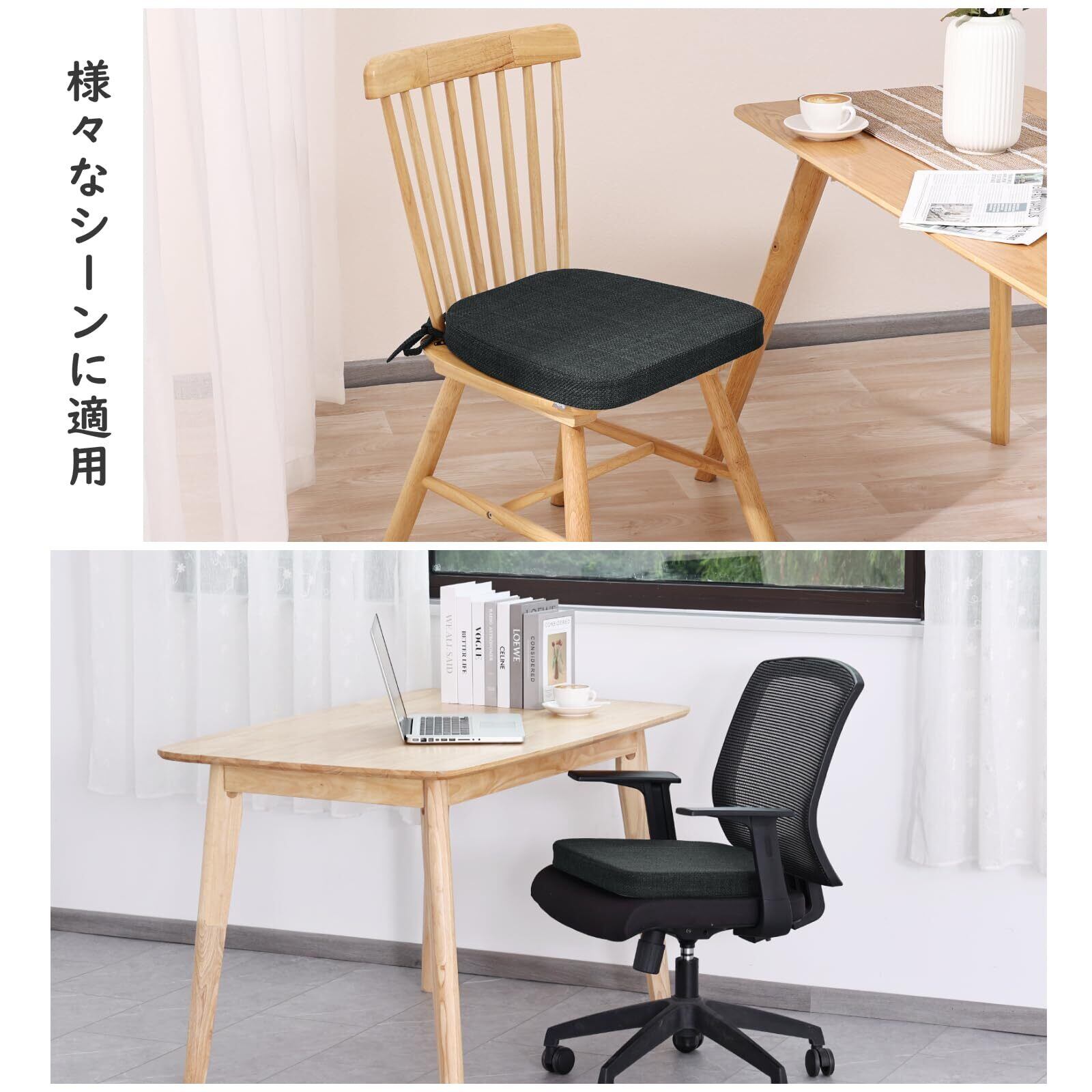 【色々場所で使える】テーブル、 ローテーブル 、座卓用クッションとしてはもちろん、シェルチェア、ダイニングチェア、オフィスチェア、車中のシート、運転席や車椅子にも置くだけで快適な座り心地に!デスクワークや長距離運転が多い方にお勧めです。3色展開、季節を選ばずオールシーズン使用できます。