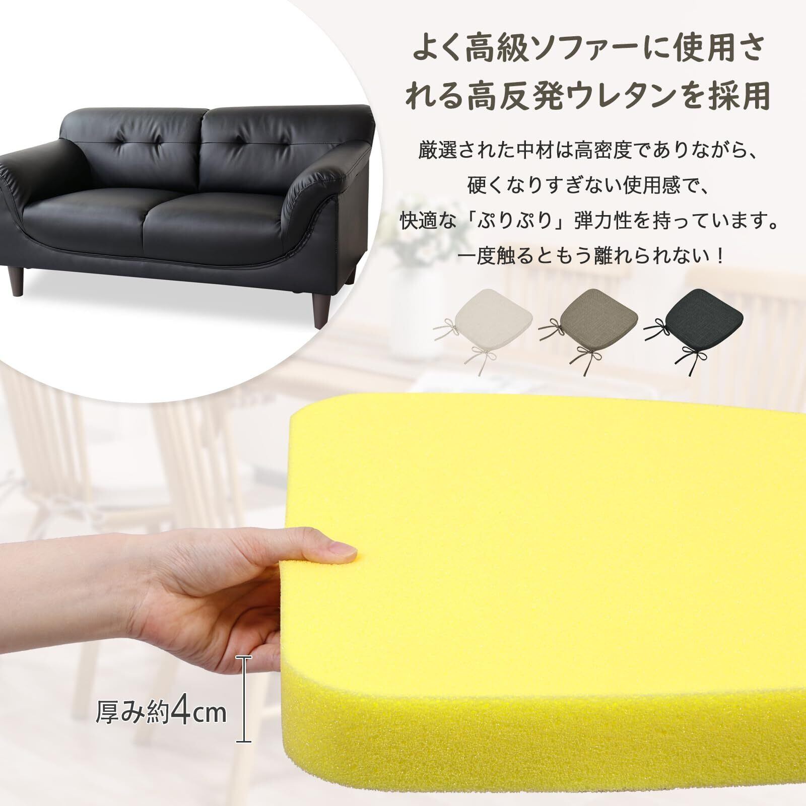【「ぷりぷり」弾力性持ち高反発座布団クッション、2枚セットお得】よく高級ソファーに使用されるぷりぷり弾力性持ち高反発ウレタンを採用、高級ソファーに座るようなしっとりと体に馴染む座り心地です。長時間使用しても疲れにくく快適です。密度の高い高反発ウレタン中材は耐久性にも優れて、へたりにくく、普通のウレタンより長く使えます。