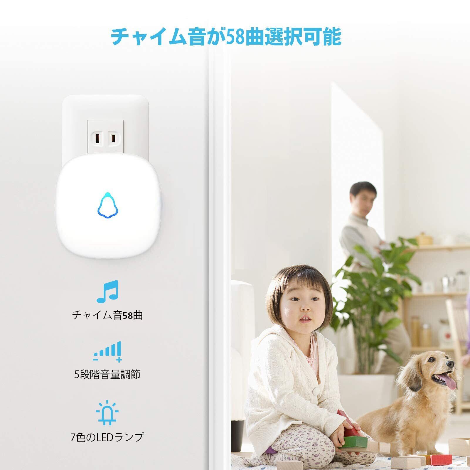 【音量調整】ワイヤレス 玄関チャイムの音量が5段階調整(0~110dB)になり、呼び出し音が58曲に増え、マナーモードでもLEDライトが点滅して来客を見逃さないようお知らせします