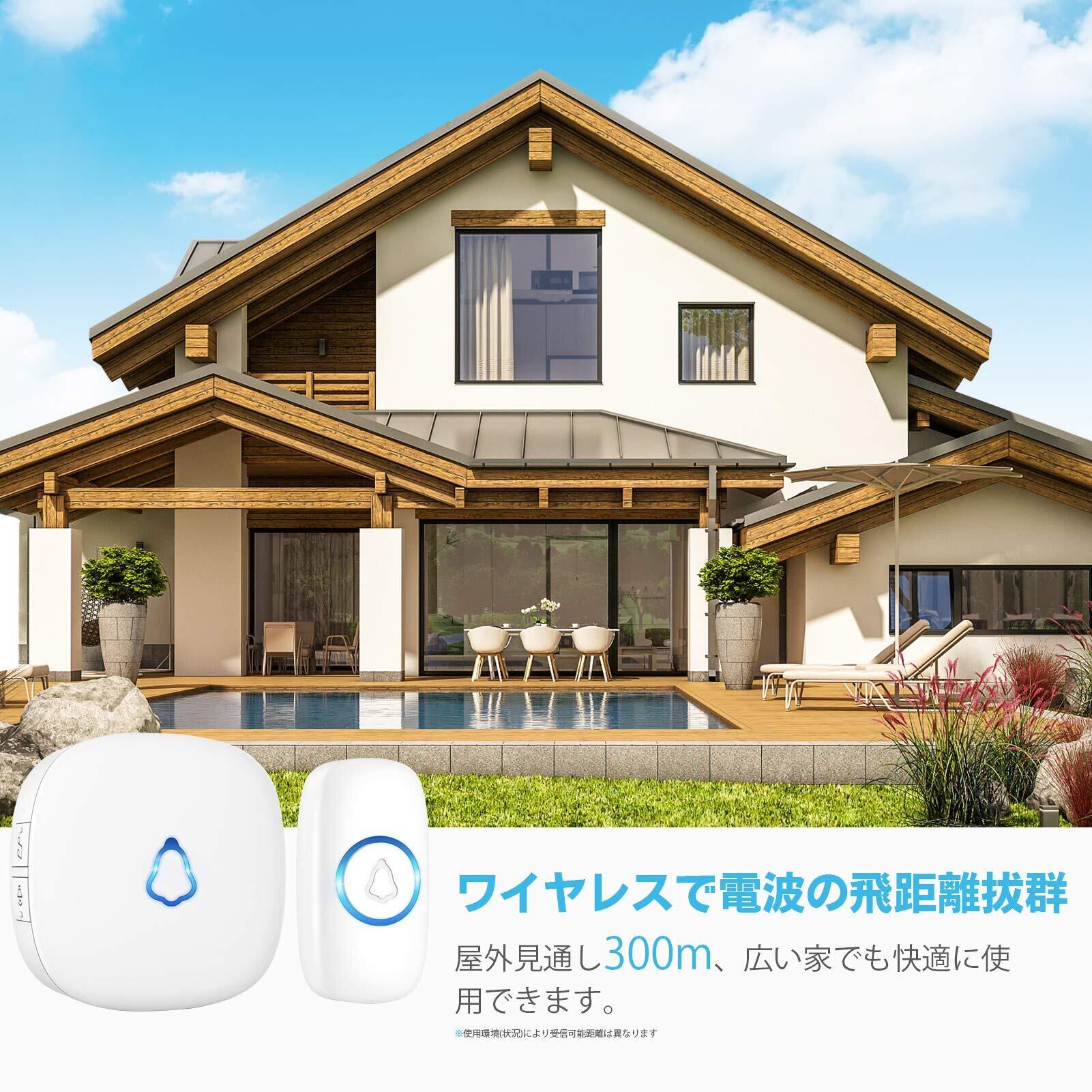 【長距離】超長距離ワイヤレス300m伝送範囲。ケーブル一切なしのワイヤレスドアベル。強力で安定したワイヤレス信号で、複数の部屋がある大邸宅でも、訪問者に気づかないことはありません。