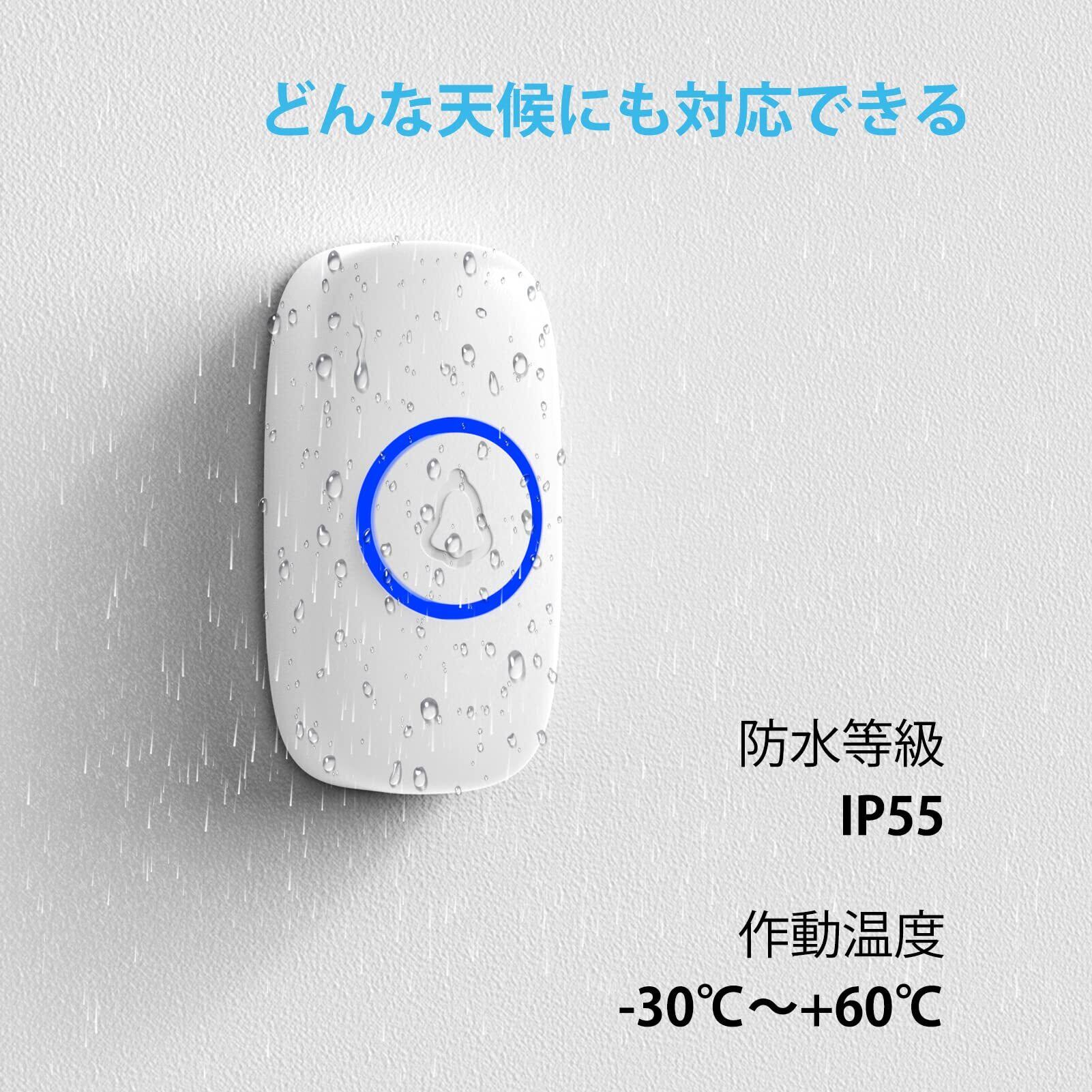 【耐水性&耐久性】チャイム ワイヤレス送信機 CR2032電池で最大3年間駆動。呼び出しベル高品質のABS素材製で、耐火性と難燃性に優れています。動作温度:-20〜60°C。IP55の防塵・防水性能。