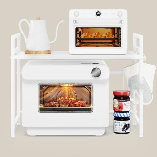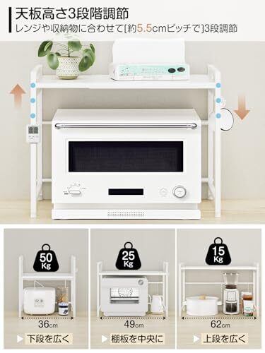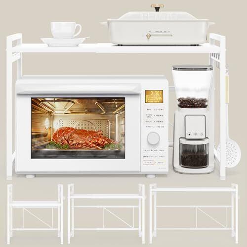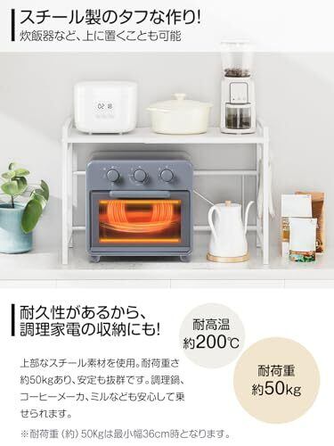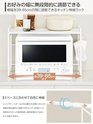 DAIWIN レンジ上ラック トースターラック レンジ置き台 伸縮式 幅36~65cm 棚板高さ調節可 耐荷重50kg シンク上キッチン収納 フック4個付き (ホワイト)