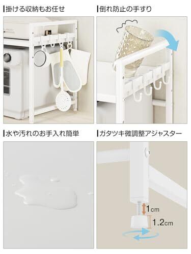 電子レンジ上のデッドスペースを有効活用できる伸縮キッチンラック:レンジ上ラックは、約幅36cm~65 cm(内寸)で無段階調整できる、可動棚板は約5.5cm間隔で3段階で高さ調節可能です。レンジの大きさや収納物の量、置く場所の広さなどに合わせたご家庭のキッチンにちょうどいい形で設置していただけます。サイドバーを4個s字フックなどを使用した吊り下げ収納に使えます。レンジラックとして使えるし、洗面台の下の棚としても使える、リビングでも使えます。オーブンレンジラックは黒、白、ブルー、グリーンの4カラーがあります。