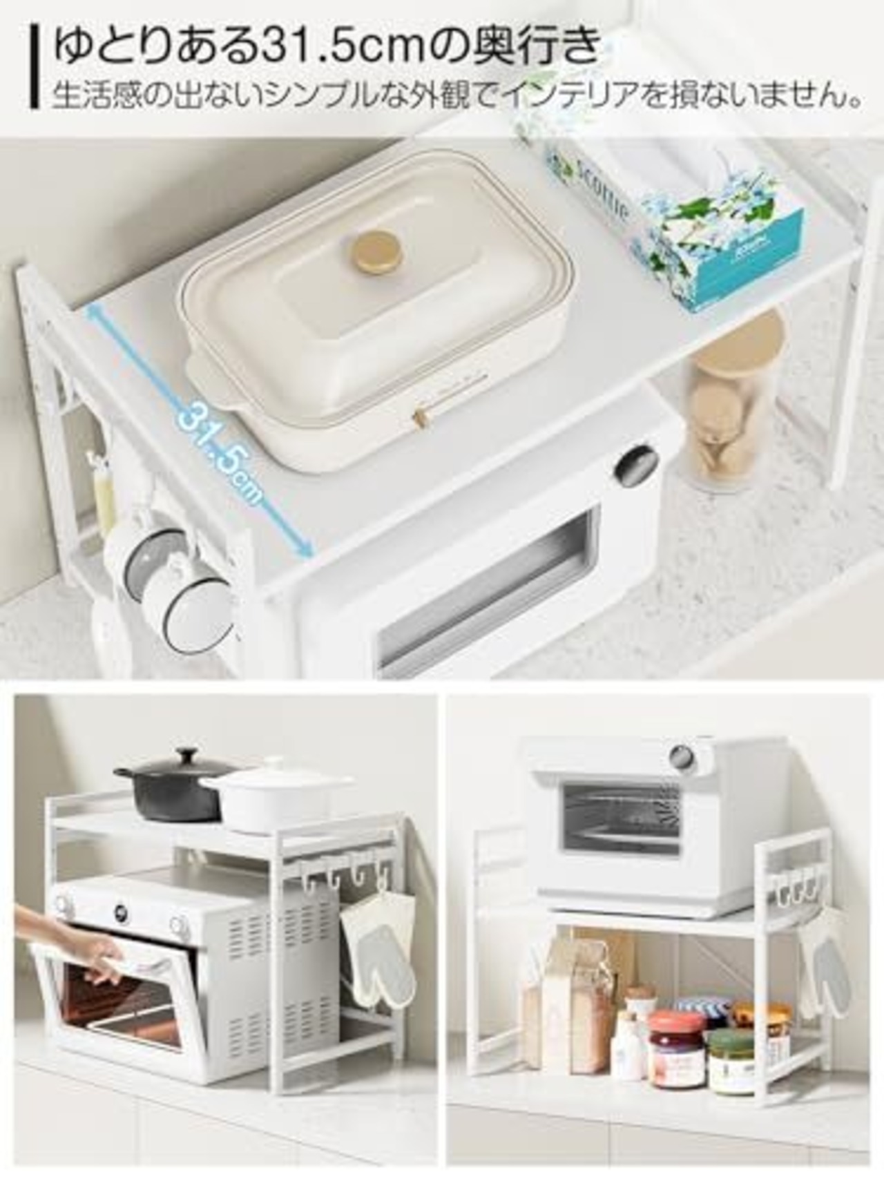 家電も置ける、ゆったり奥行き31.5cm:棚板の奥行きはゆったり広めの約31.5cm。トースターなどのキッチン家電や、フライパンや鍋、収納用バスケットなど大きな物も収納していただけます。シンプル設計だからこそ、カウンター上などの高い位置に置いても圧迫感を感じにくく、すっきりと見せていただけます。