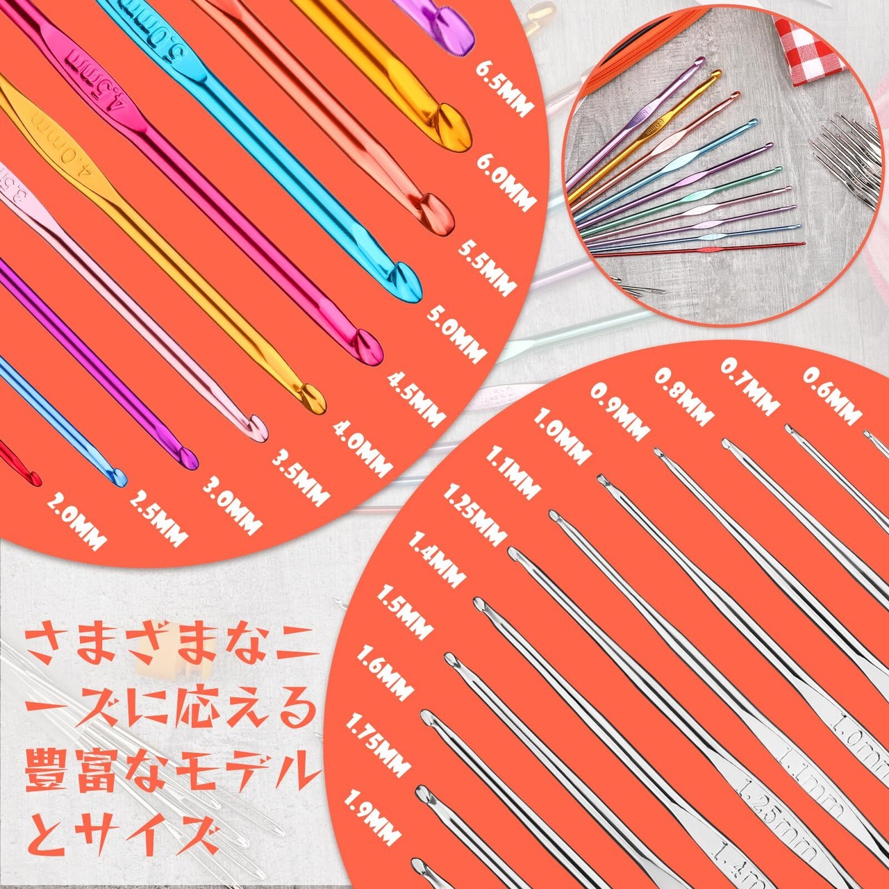 22サイズのかぎ針編みフックセット:カラフルなかぎ針編みフックのサイズは2.0mm、2.5mm、3.0mm、3.5mm、4.0mm、4.5mm、5.0mm、5.5mm、6.0mm、6.5mm、および小さなかぎ針編みフックのサイズです。 0.6mmから1.9mmまであります