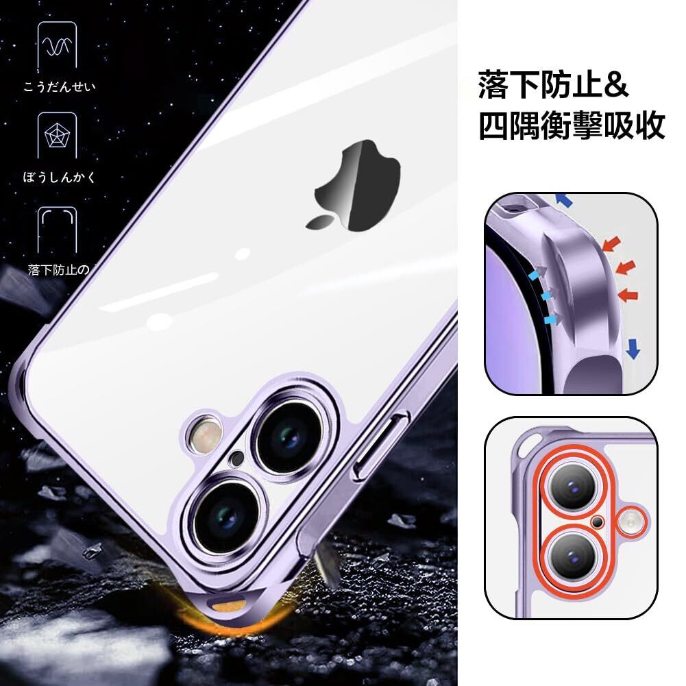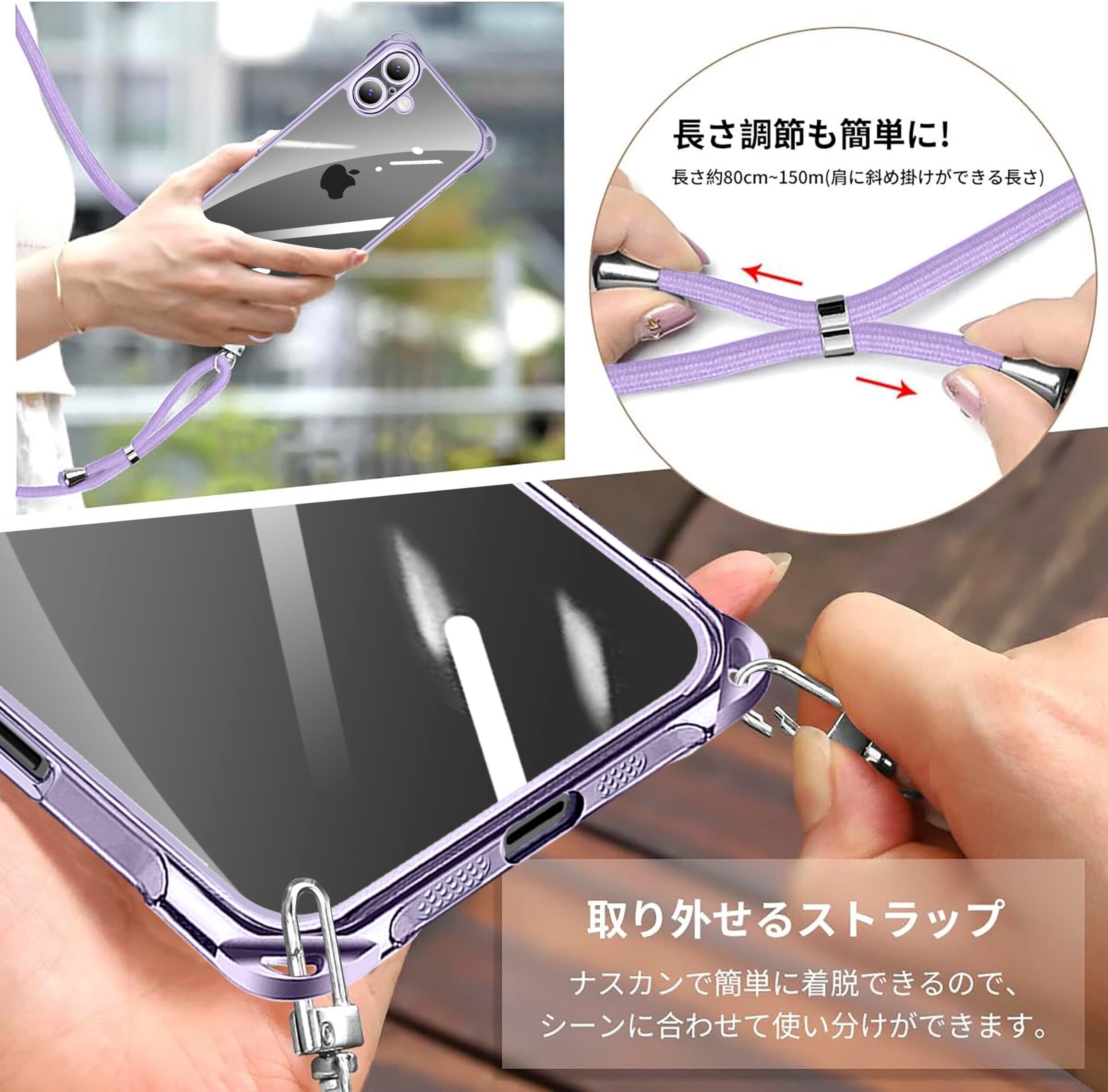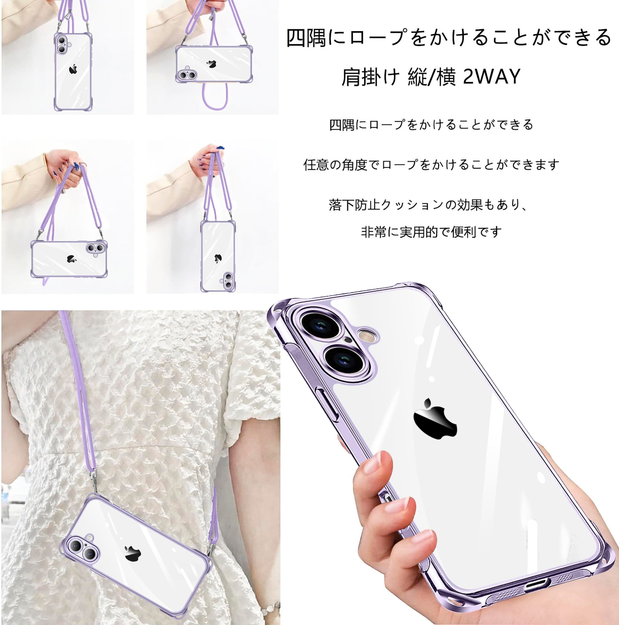 iPhone 16 用 ケース クリア ショルダー 耐衝撃 アイフォン16 用 スマホケース 透明 薄型 軽量 カバー 首かけ 肩掛け 縄掛けケース ストラップ付き 縦/横 2WAY 取り外し可能 長さ調整可能 ワイヤレス充電対応(パープル)