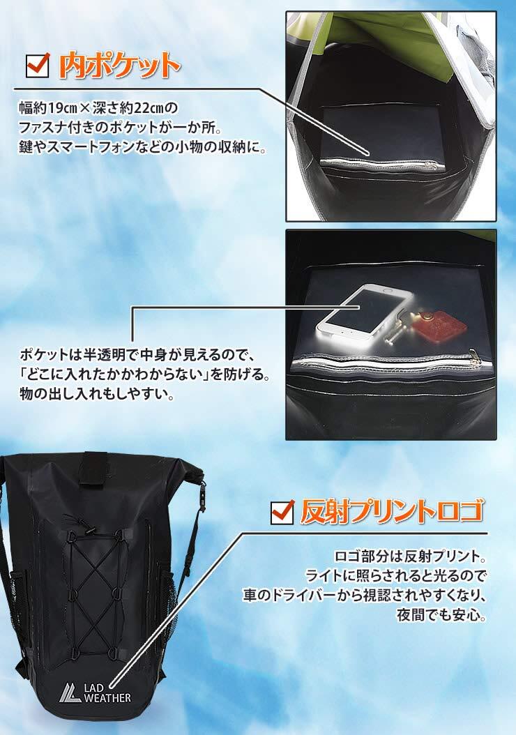 ●すごいのは防水、容量だけじゃない! ・ロゴ部分は反射プリントを採用。光を反射するので夜間でも安心。 ・衝撃を吸収する緩衝材入りの肉厚ベルト。長時間荷物を持ち歩いても肩を痛めません。通気性がよく、乾きやすい素材です。 ・携帯ライト、折り畳み傘、鍵などを付けられるDリング。 ・体との一体感を高め、疲労を緩和します。高さ、長さの調節も可能。どんな体型にもフィットします。 ・背面にあたる部分には通気性の良いメッシュ生地を使用。 ・肩甲骨や腰など体に密着する部分もメッシュ生地を使用。メッシュ部分は厚手のクッションなので背中にもしっかりフィット。長い時間背負っていても快適。 ・ショルダー部分も体に当たる面は同一素材になっており、長時間の使用にも安心のデザイン。大きな織り目で乾きも早いです。 ・500mlのペットボトルも入るメッシュポケットが両サイドに。飲み物などこまめに使う物を入れておけば、バックを開けずに取り出せて便利。