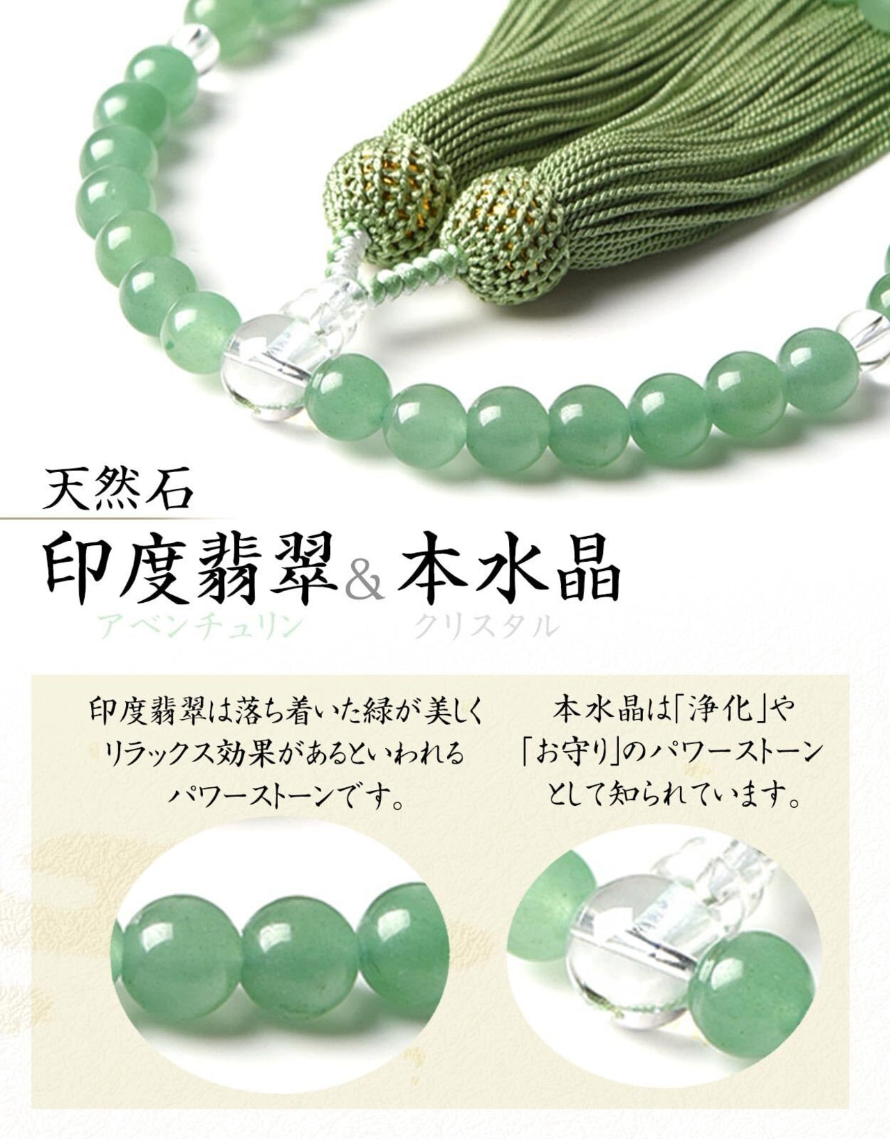 数珠の素材:印度翡翠/本水晶…主珠:8mm玉、親珠:10mm玉、天珠:6mm玉、人絹頭付房