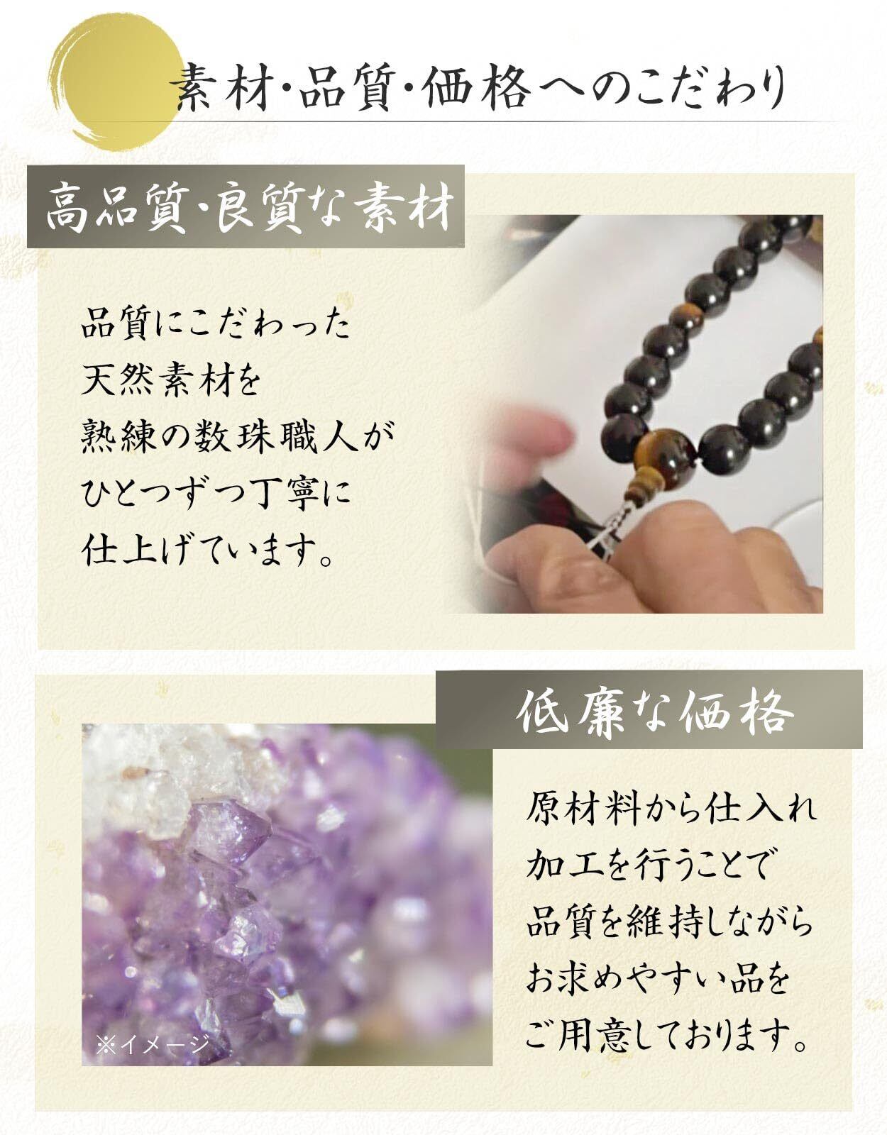 熟練数珠職人が天然素材を丁寧に加工し、素材本来の美しさを際立たせるよう品質に拘りました。