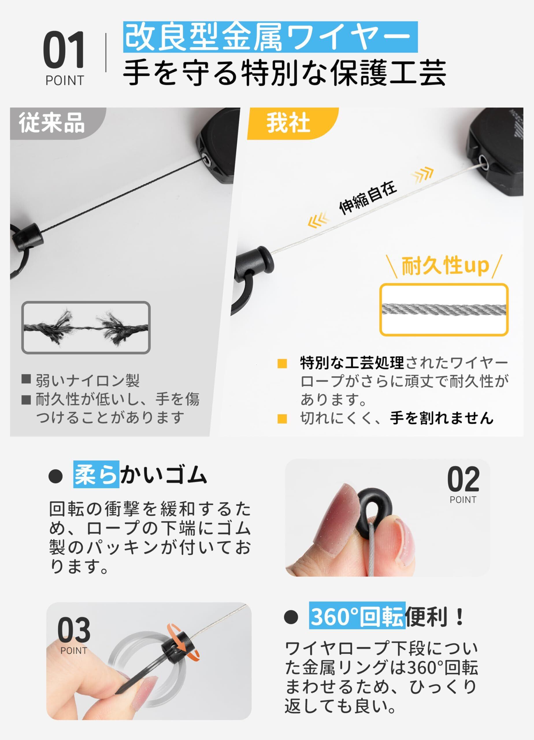 【ABS+亜鉛合金=軽くて丈夫】当社のキーリールは、より軽量で耐久性に優れたABS素材を使用しています。また、ロープ部分には高強度の金属ワイヤーを採用し、耐久性をさらに向上させました。この設計により、軽量ながらも日常の使用でも安心してご利用いただけます