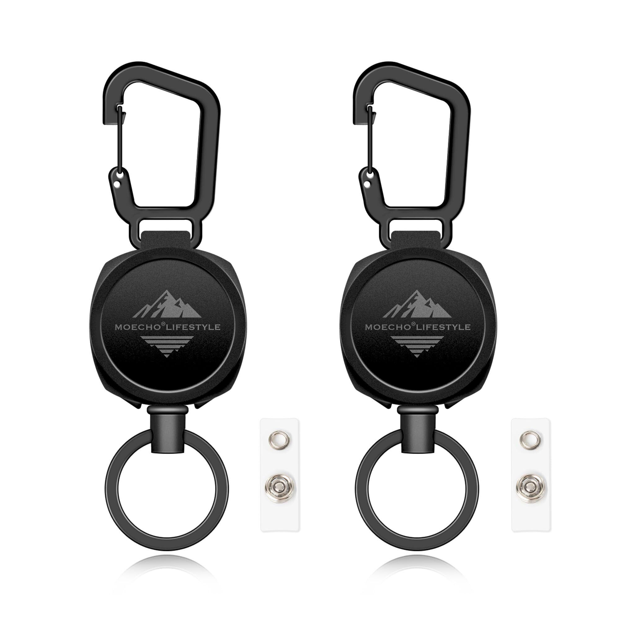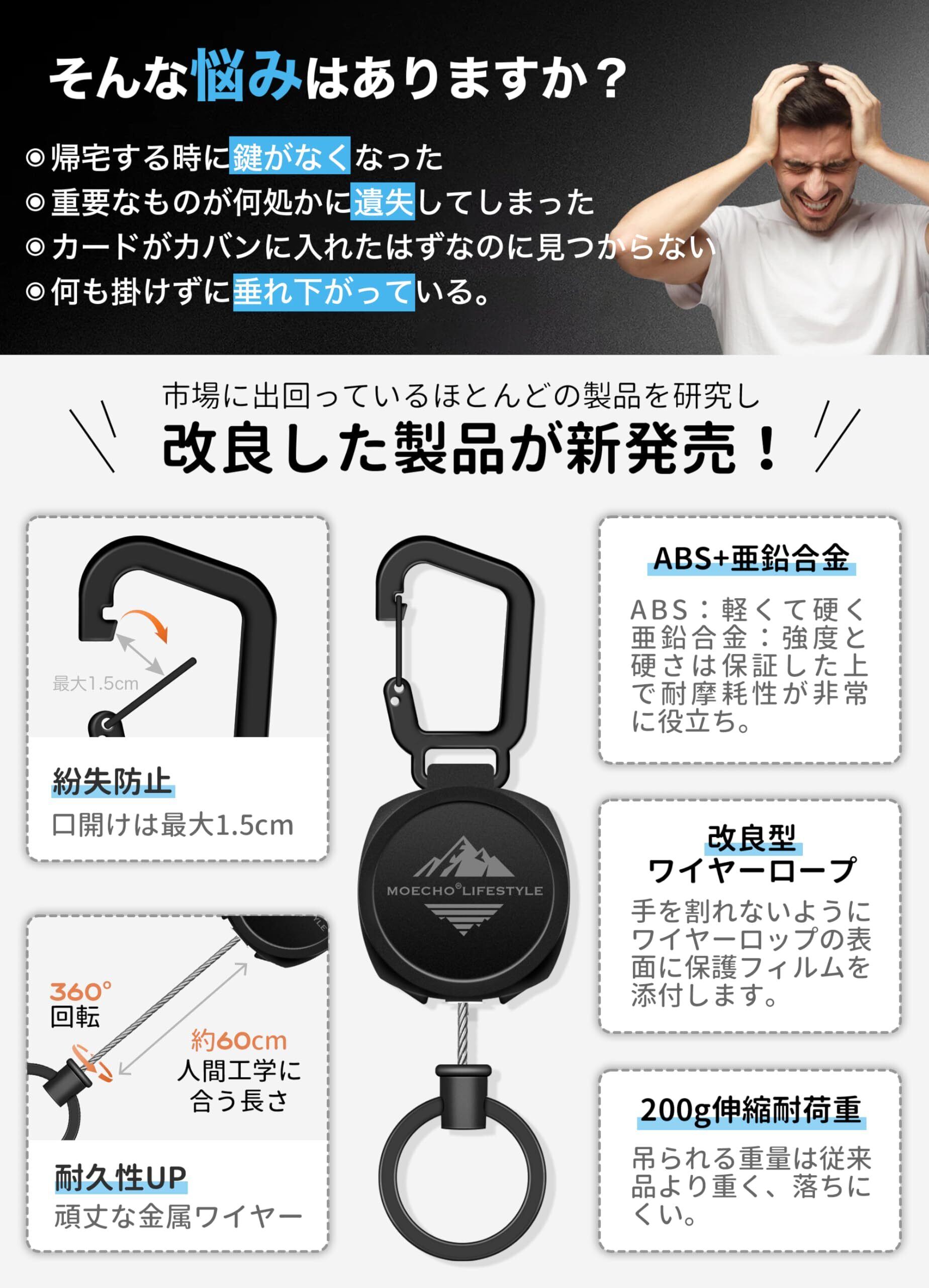 [MOECHO] リールキーホルダー 強力 キーチェーン 【新登場改良型·2つセット·多機能·200g伸縮耐荷重】 カラビナ キーホルダー リール 頑丈 キーチェーン 伸びる 鍵 キーホルダー ストラップ 金属ワイヤー 落下 紛失防止 アウトドア 山登り 釣り 吊り下げ名札 ベルトクリップ付き (ブラック‐2個)