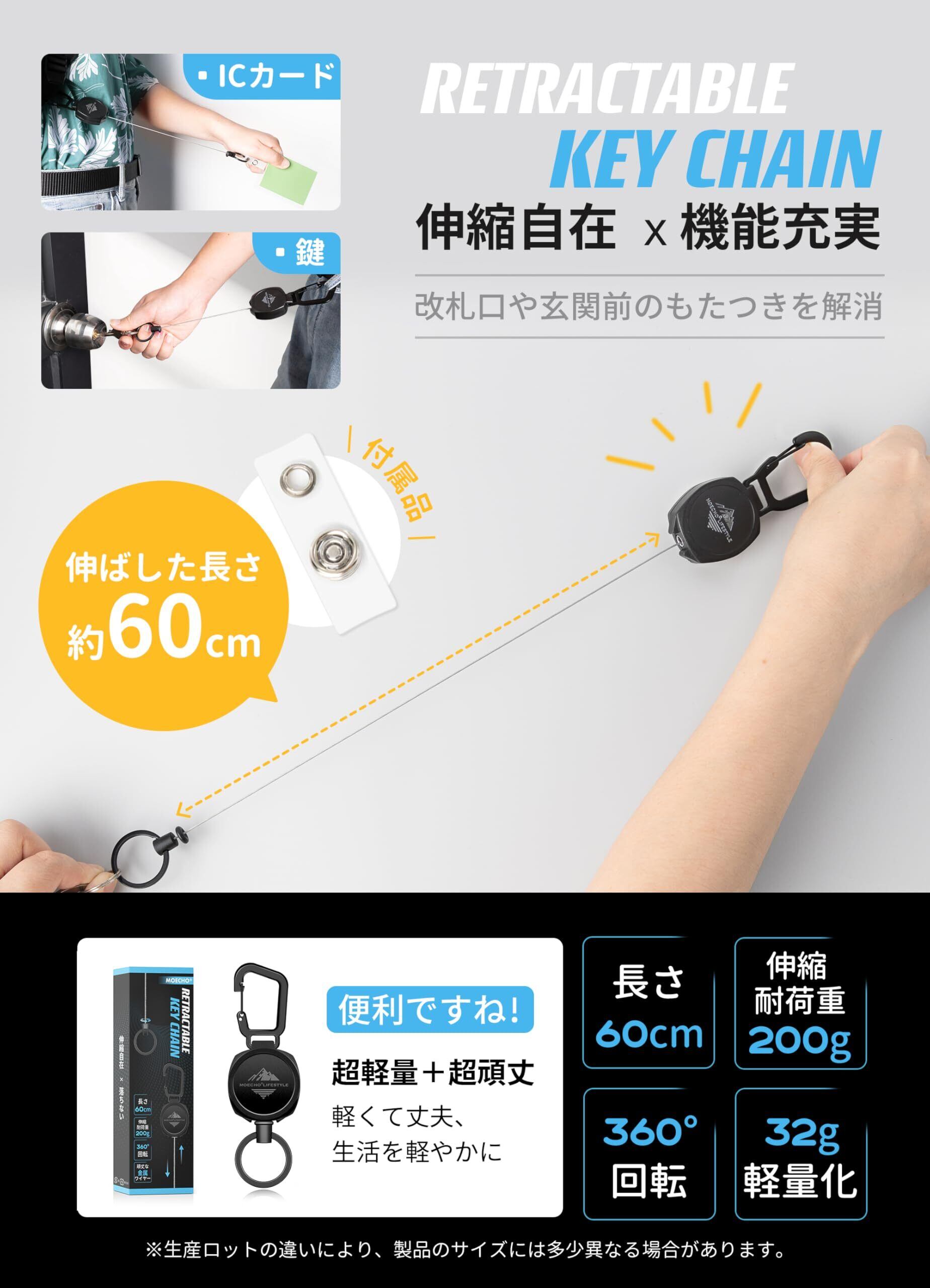 【60cmロープ・自由に収縮】落下防止のため、この製品は200gの伸縮耐荷重があり、10本の鍵を掛けても下垂しません。日常の外出時にも快適にご使用いただけます。使用後はすぐに元の長さに戻るため、紐が垂れ下がって煩わしいことがありません。また、伸びる際には人間工学に基づいて設計された適切な60cmのロープを採用しており、快適な使用感を提供します