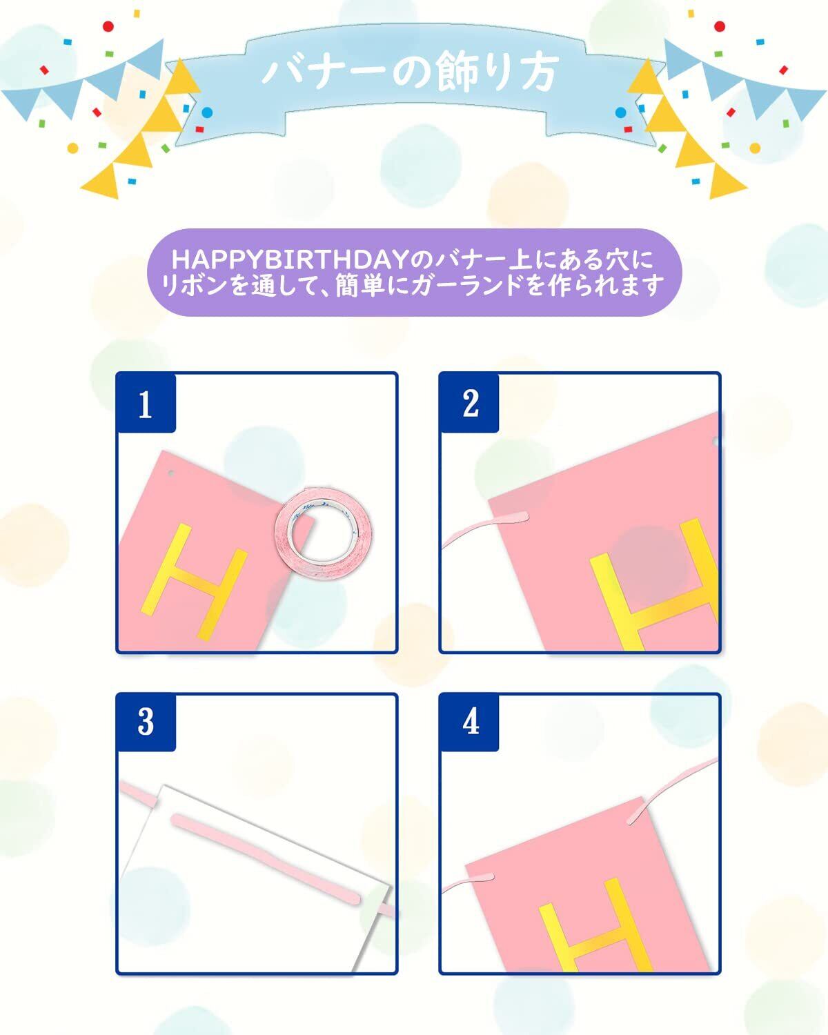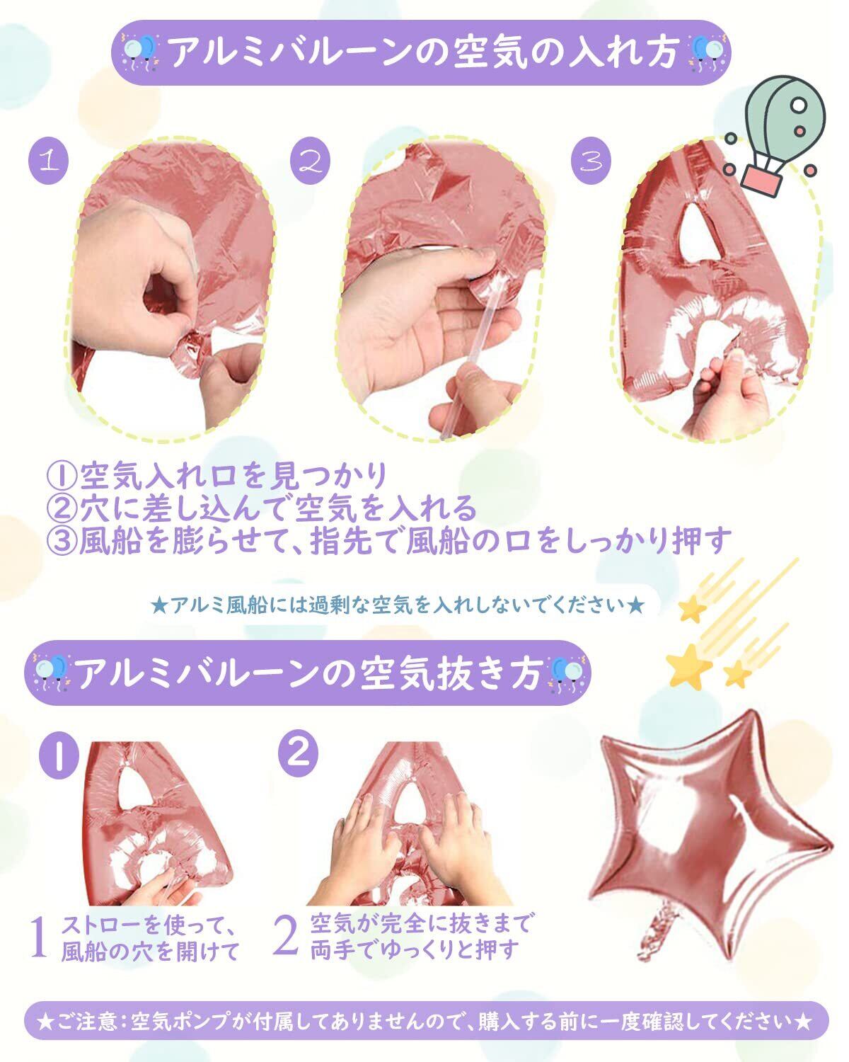 ご注意事項:本製品は装飾品となっております. 6歳未満のお子様が口にしないよう細心の注意をお願い致します. 風船に空気を入れる際は、破れないように少しずつ空気を入れてください. 特に、アルミ風船は空気を入れすぎると破裂してしまうこともあります. 指で押して、少し凹むくらいがベストです. 入荷時期により多少形や色合いが異なる場合がございますのでご了承ください. 結びリボンと壁貼り両面シールは混じて使ってください. 部屋にバルーンを貼る場所がない場合はリボンで室内の壁や窓、または庭に掛けることができます. とても便利です. 誕生日の後、 壁にダメージを与えますので、できる限りリボンを使用することをお勧め致します. リボンは長くて操作も簡単です