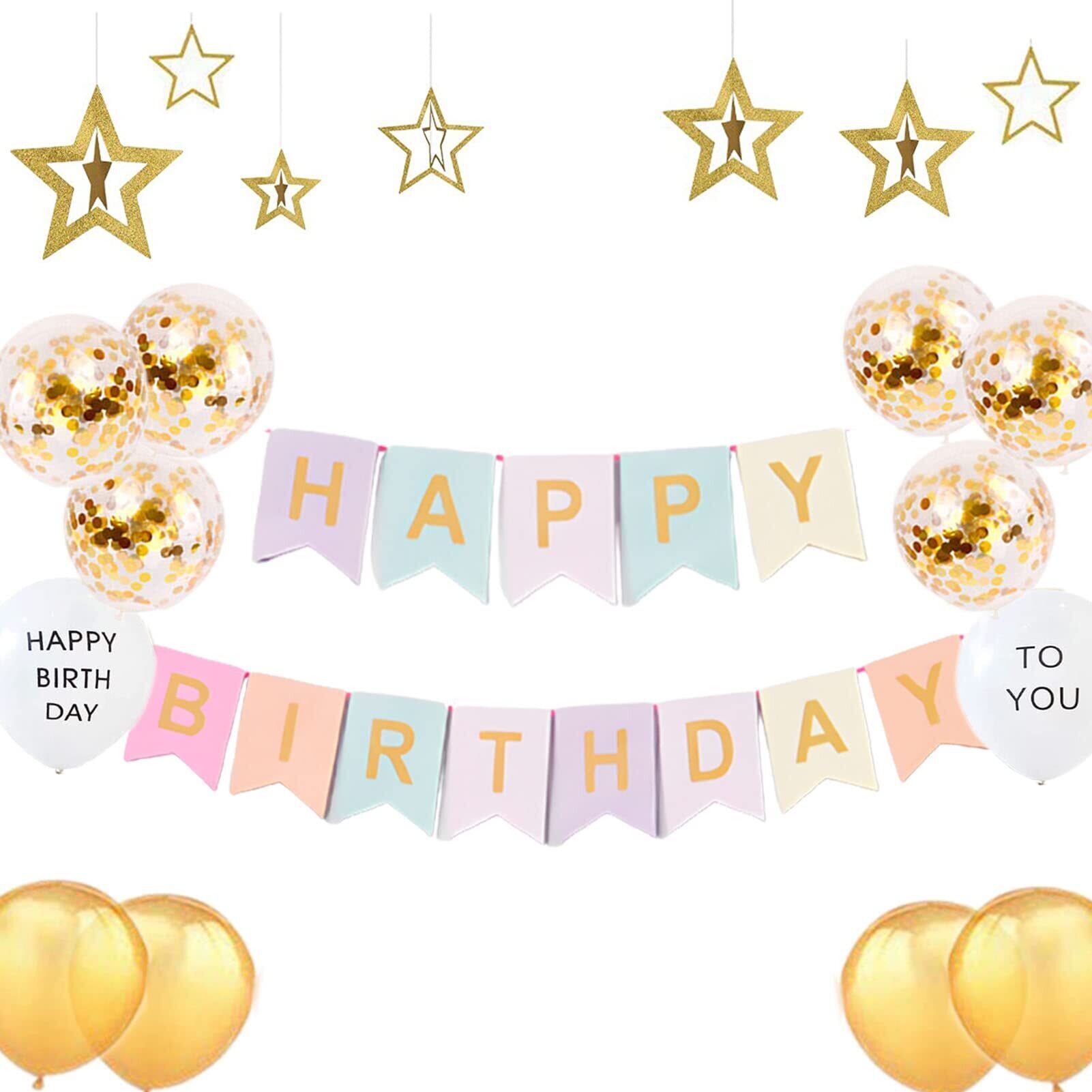 輝くセット&数字バルーン&お買い得:キラキラしている 誕生日 飾り付け セット&新しい風船セットを追加!!!セット内容:①「HAPPY BIRTHDAY」ガーランドバースデーガーランド×1セット ②紙吹雪風船×6 ③星のガーランド×1セット ④吸込管×1本 ⑤ゴールドリボン×10m ⑥ドットシール×20点 ⑦カスタマーサービスカードx1. 追加風船セットの内容:ゴールド風船×4、HAPPY BIRTHDAY TO YOUバルーン×1セット