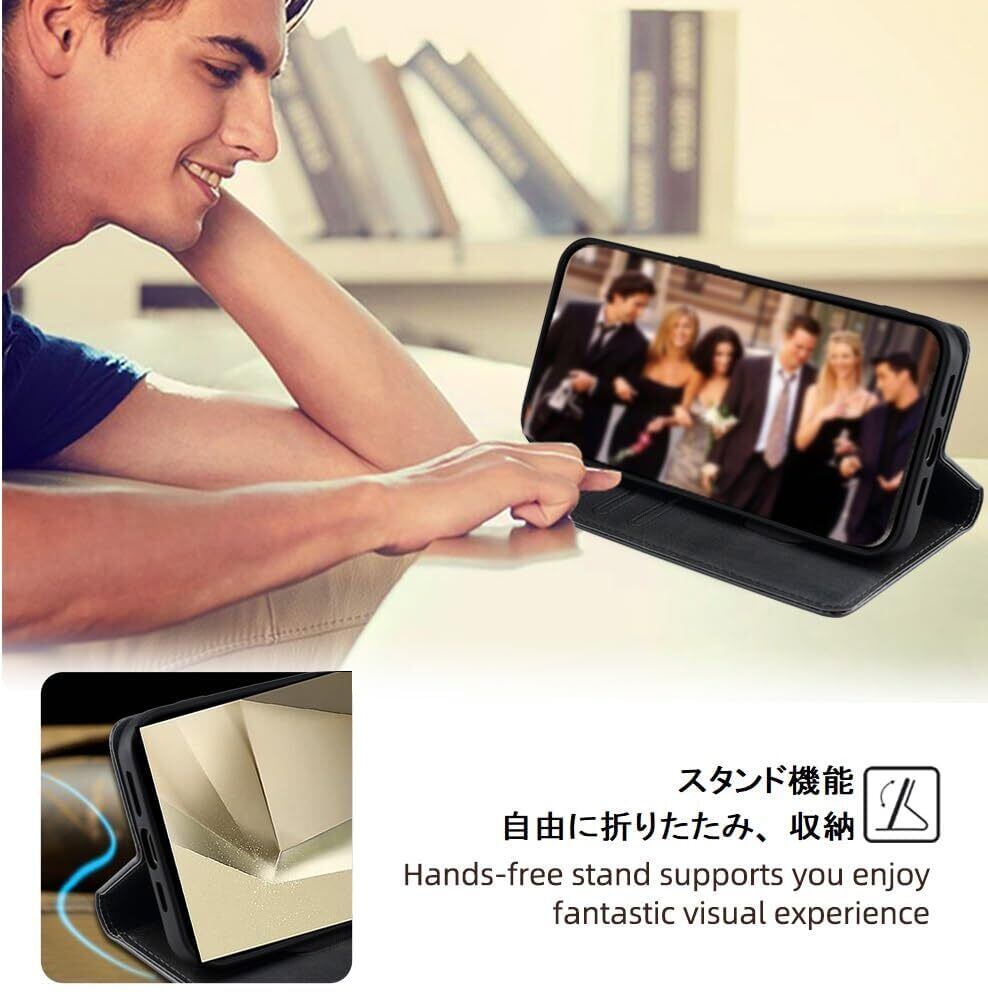 「スタンド機能&装着便利」レザーカバーの内面にソフトケースで装着簡単、素材には合皮レザーが使われており、おしゃれなデザインが特徴です。さらに、ケースを折って立たせることで、スマホスタンドとしても利用することができます。