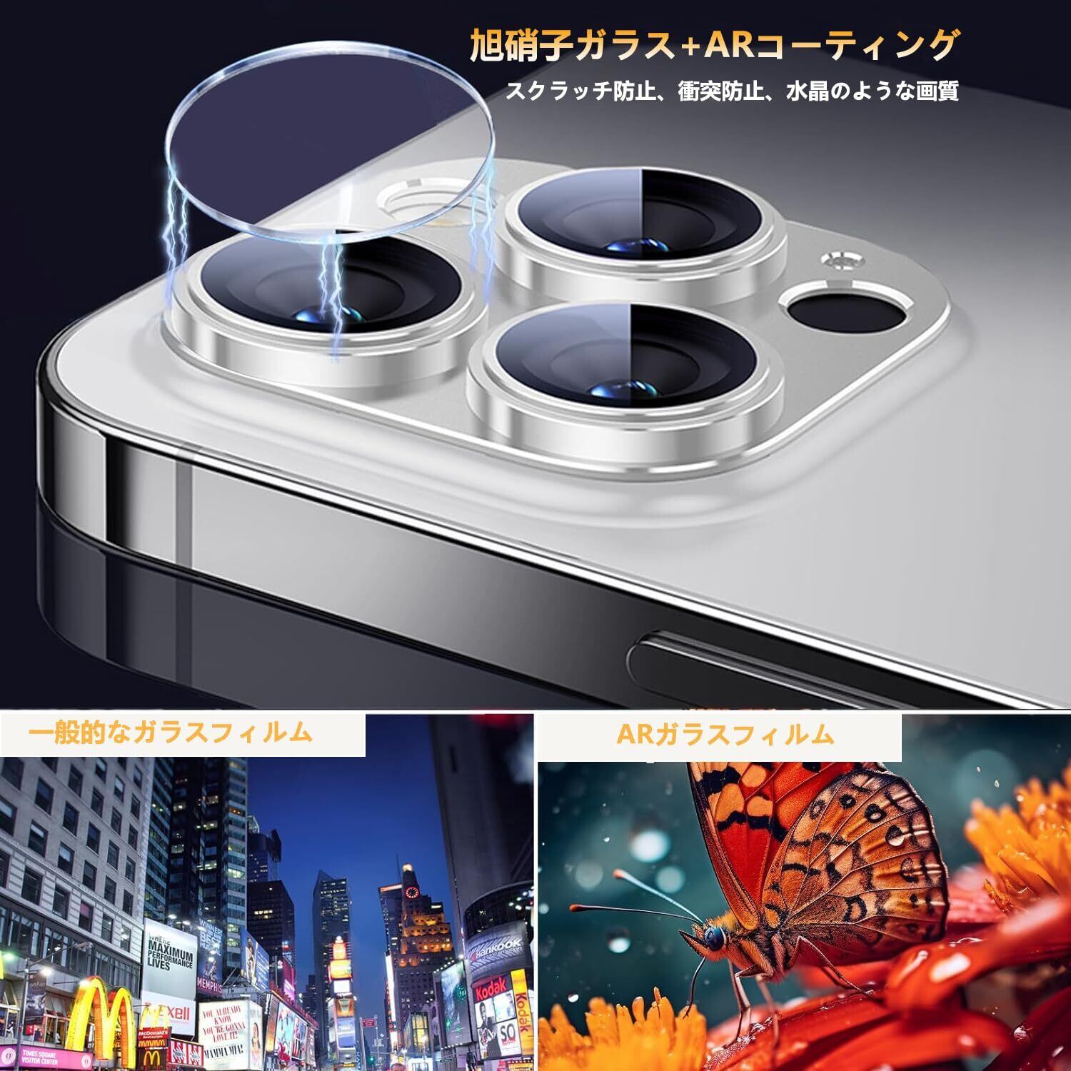 3.【AR超高透過率・露出オーバー防止】 アイフォン16Pro・16Pro Maxカメラ レンズ保護カバーは、光学コーディング層(AR)技術を採用しています。高透過のガラスで元々の高画質が損なわれなくてリアルな色彩を実現します。また、金属ベースと黒縁仕上げにより、露出オーバー、フレア、ゴーストなどを防止できます。昼夜を問わず、カメラの自動露出機能に干渉せず、カメラの高画質と優れた描写性能をフル発揮して、本格的なiPhone撮影体験を存分に楽しめます!
