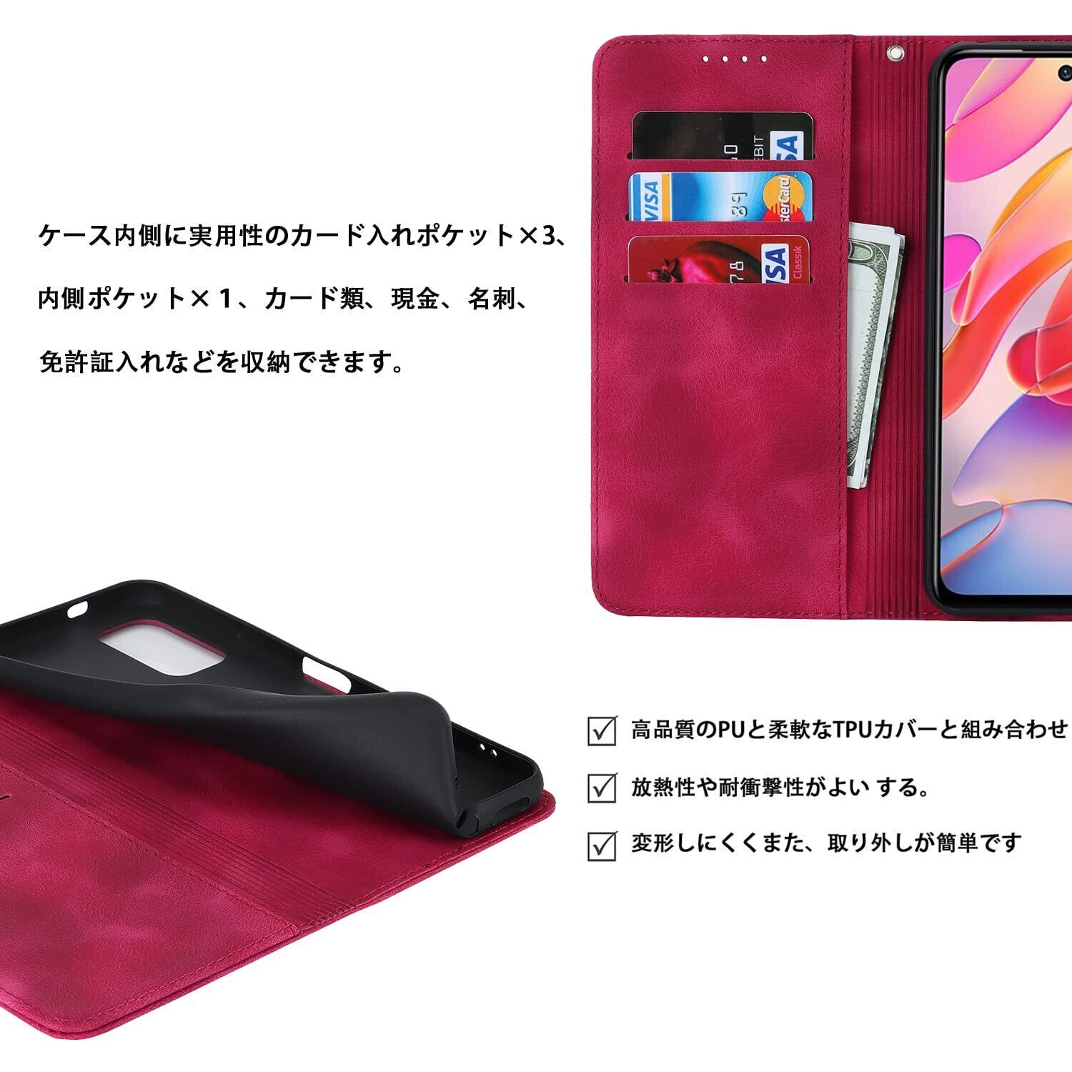 【収納機能】Redmi Note 10 JE/Note 10Tケース内側に実用性のカード入れポケット×3、内側ポケット×1、カード類、現金、名刺、免許証入れなどを収納でき、通勤も通学にも楽々タイプです。内蔵マグネットの機能を最大限に発揮させ、カードの消磁を防ぐために、カードスロットに2枚のカードをセットすることを推奨します。