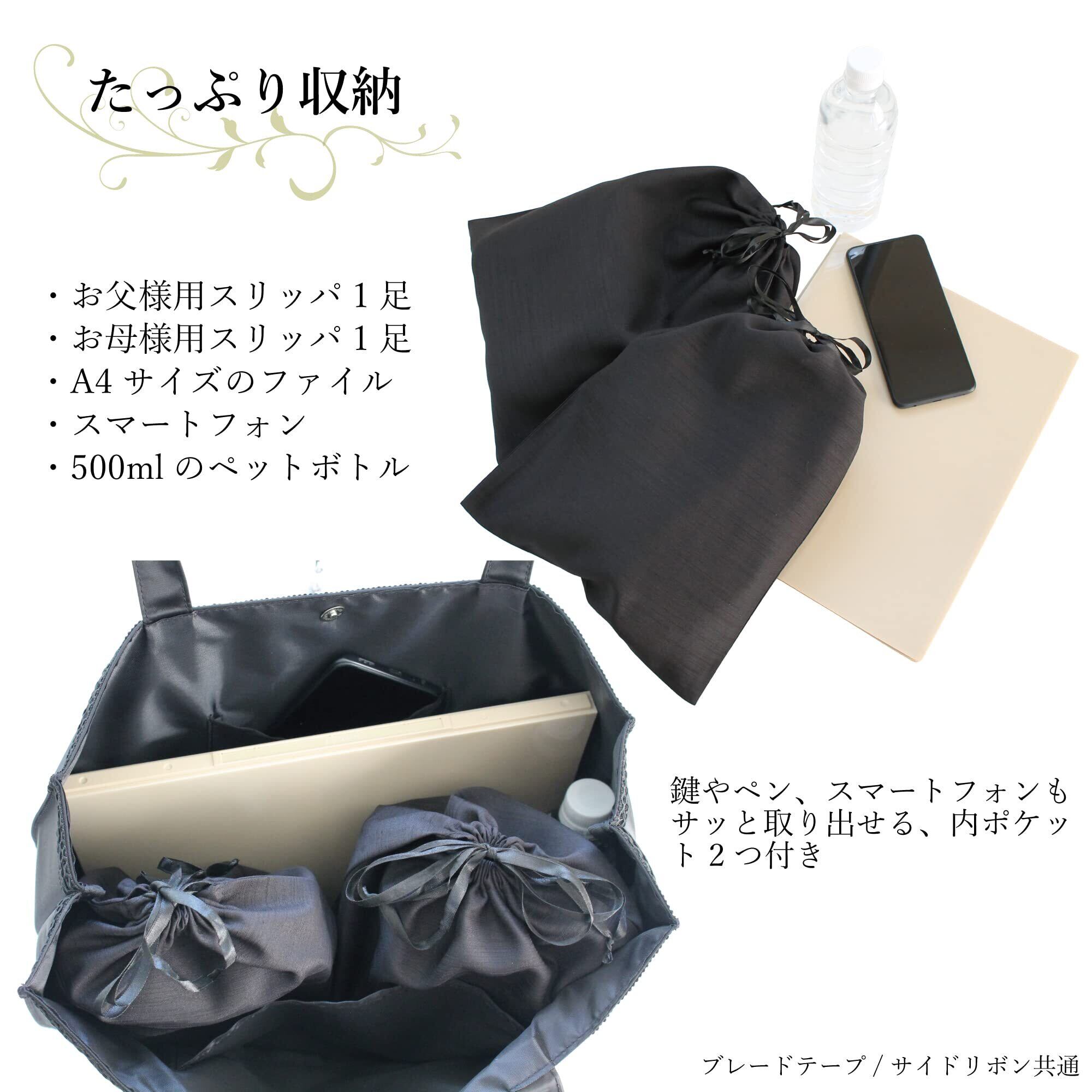 機能 A4の書類・スリッパ2足(お父様・お母様用)もしくは下足2足、お手回り品も十分に収納できるサイズです。マグネットの留めボタン付きです。