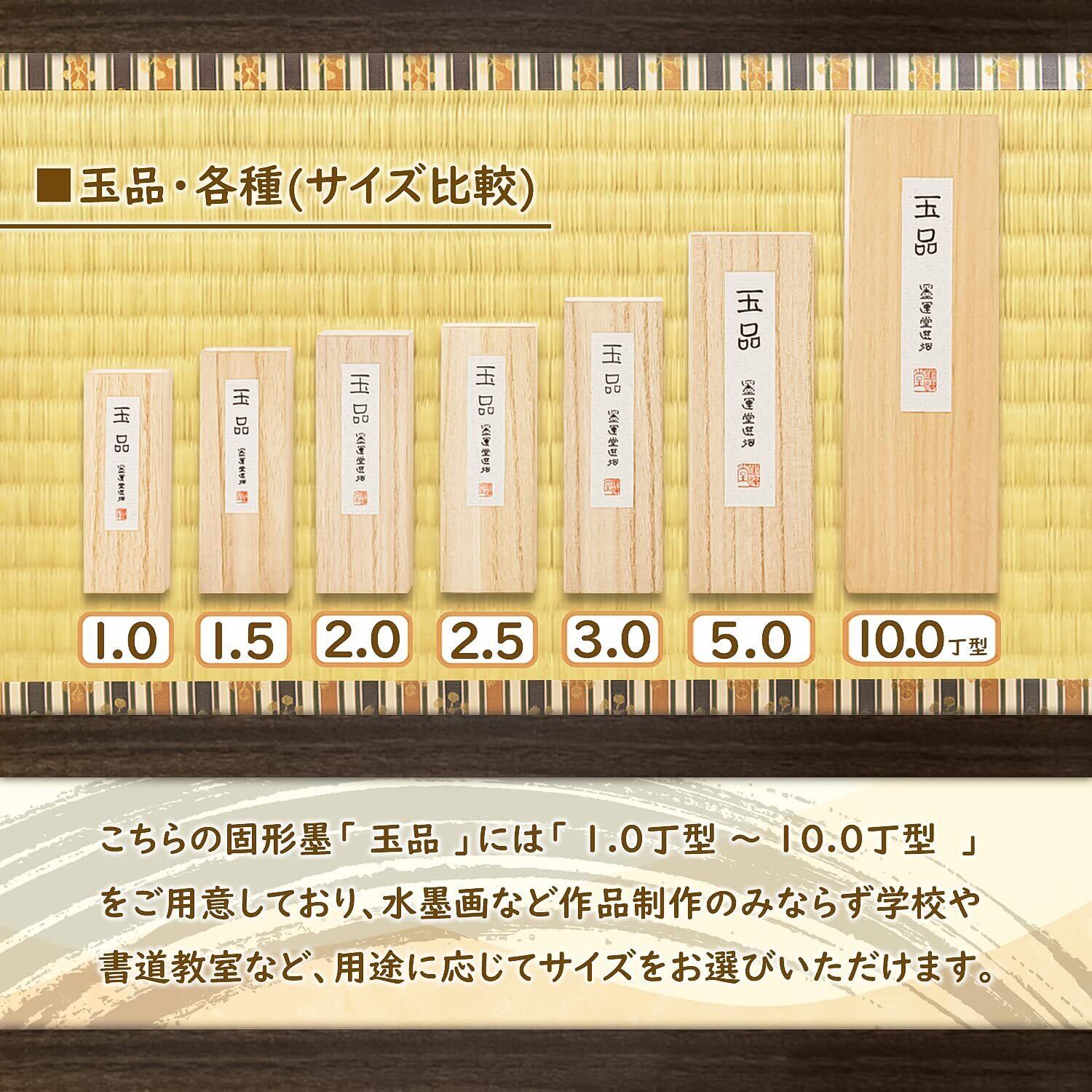 【玉品】漢字練習用、清書用で半紙、画仙紙向き。普通の濃さから濃墨まで、古くなるほど超濃墨まで使えるが、淡墨には不向き。作品用には陳玄の試用を推奨