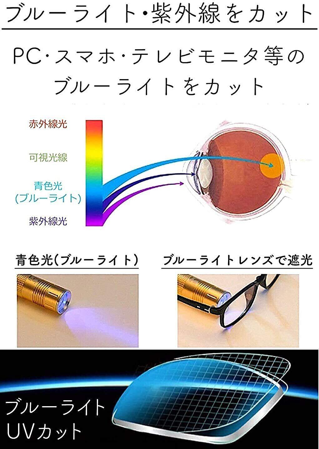 【商品詳細】品名:ファッションメガネ(ブルーライトカット/PC眼鏡) 材質:レンズ→プラスチック(UVカット・ブルーライトカット・コーティング) レンズ枠:プラスチック テンプル:プラスチック