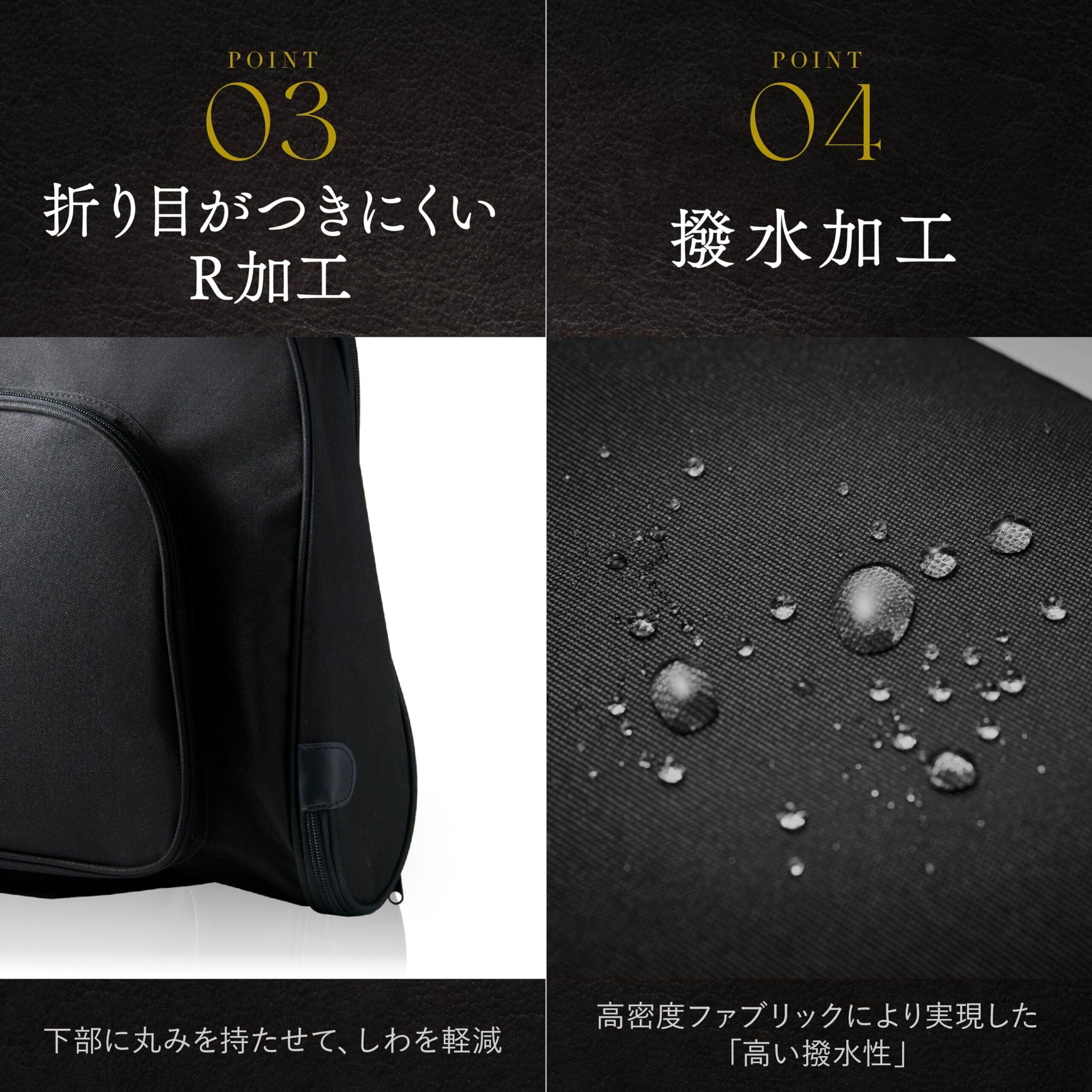■【高密度ファブリックを使用した素材】大切なスーツを守るために開発されたガーメントケースだから、当然のことながら雨や雪などにも対応している。最高級の素材を使用した高密度ファブリックをふんだんにしようすることにより、高い撥水性を実現した。また、持ち運びに適した重さと大きさを追求し、高い機能性を実現。軽量かつ使いやすいケースに仕上がっている。スーツだけではなく、ネクタイやワイシャツも収納可能。また。男性だけではなく、女性用のドレスなども持ち運ぶことができるため、結婚式やお子様の発表会などでも重宝すること間違いなし。軽量さとコンパクトさ、さらにデザイン性を併せ持つ、ガーメントバッグは、さまざまなシーンで活躍する。