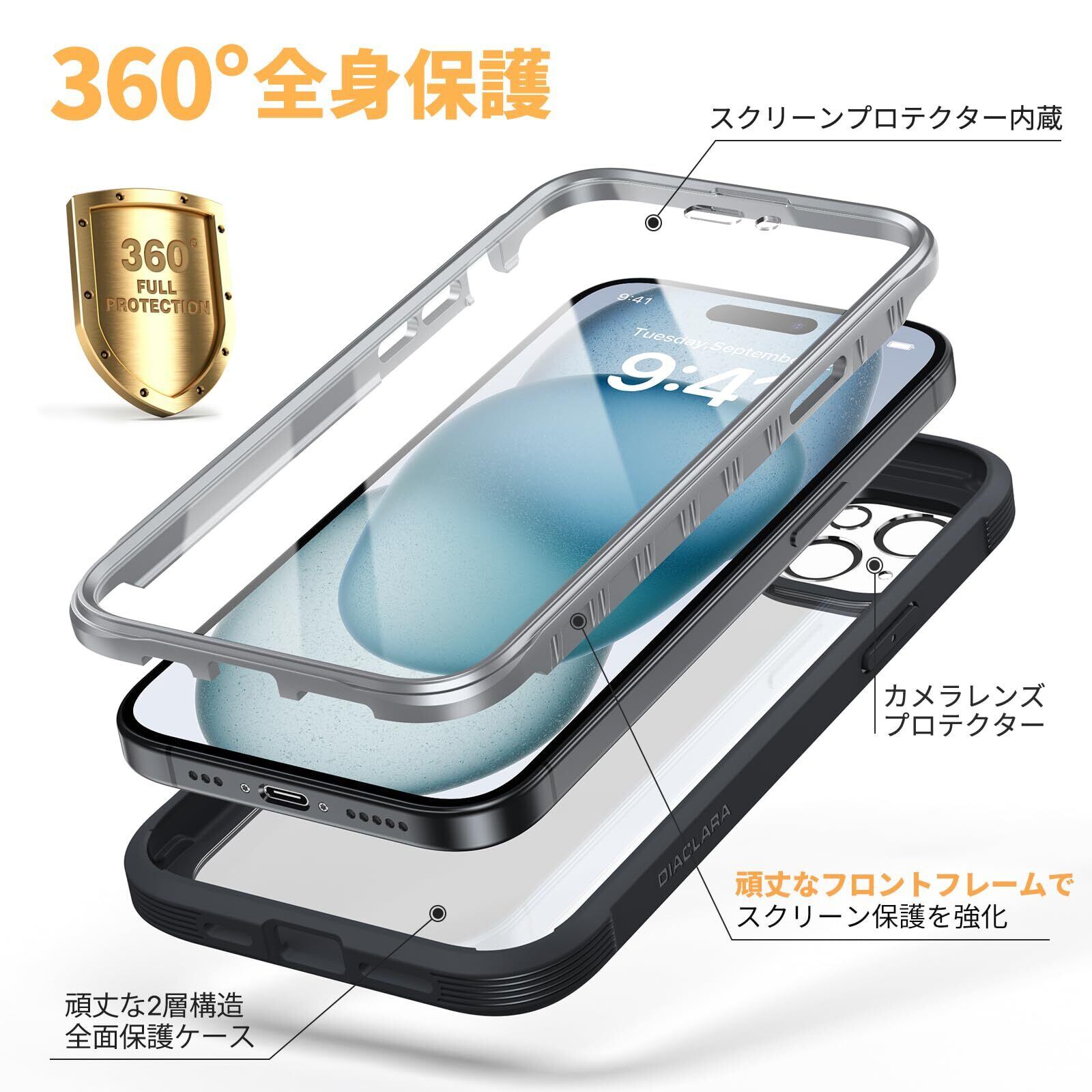 「360°フルボディで頑丈な保護」TPUとPCの2重構造で耐衝撃性に優れ、嵌め込み式バンパーと透明バックカバーの組み合わせにより、スマホ本体の美しさを邪魔しなく、頑丈な保護を提供します。スマホ本体をを囲む4つのコーナーが不意の落下からiphone15を保護します。