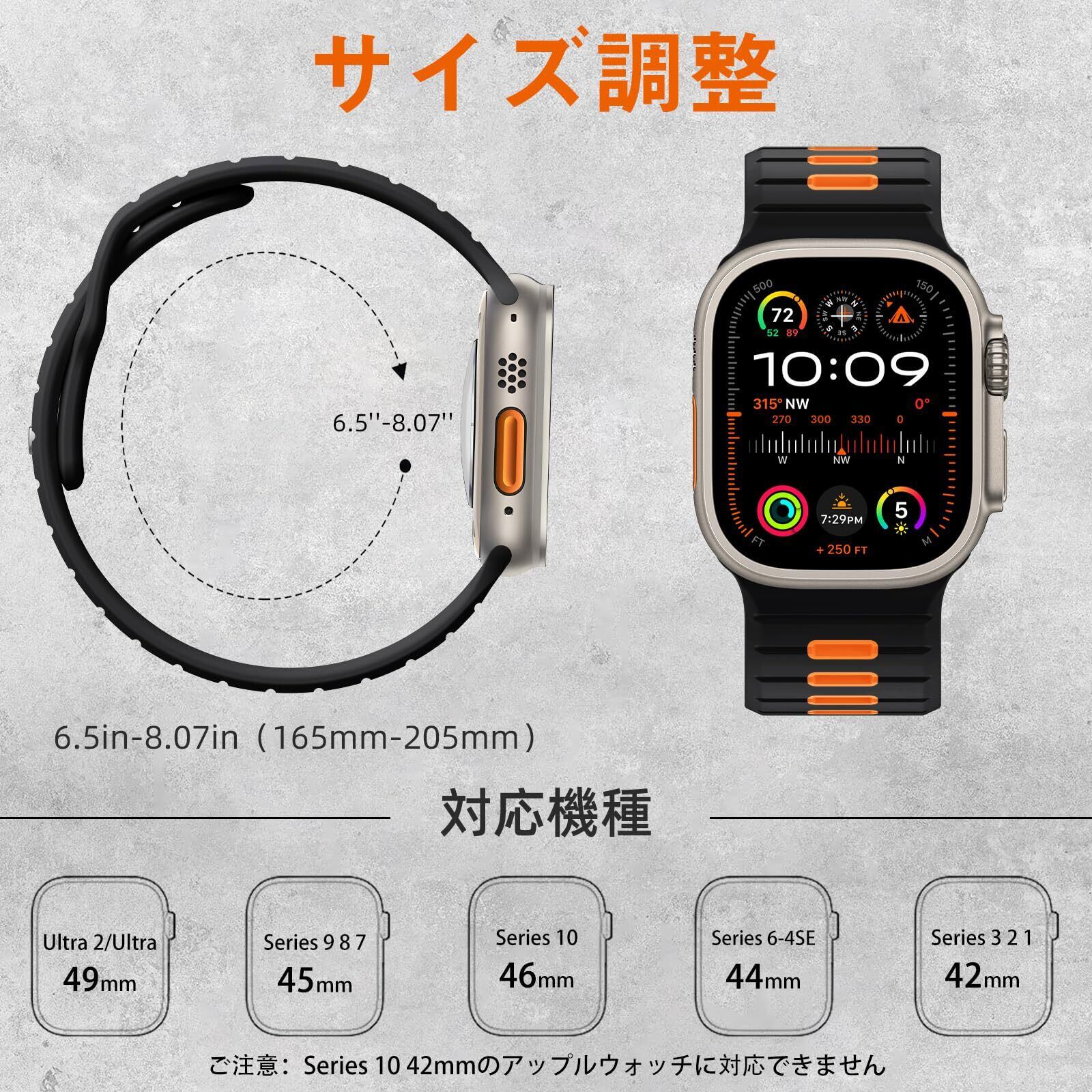 【商品仕様】アップルウォッチ用 シリコン バンドは、Apple用 Watch Ultra/Ultra2 49mm、Series 10/9/SE/8/7/6/5/4/3/2/1 46mm 45mm 44mm 49mm 41mm 40mm 42mm 38mmに対応しています。(Apple用 Watch 本体は付属しておりません。バンドのみです。)手首サイズは132-205mmの方に適しており、長さは調整可能です。購入前に、お手首の周りを測定してください。