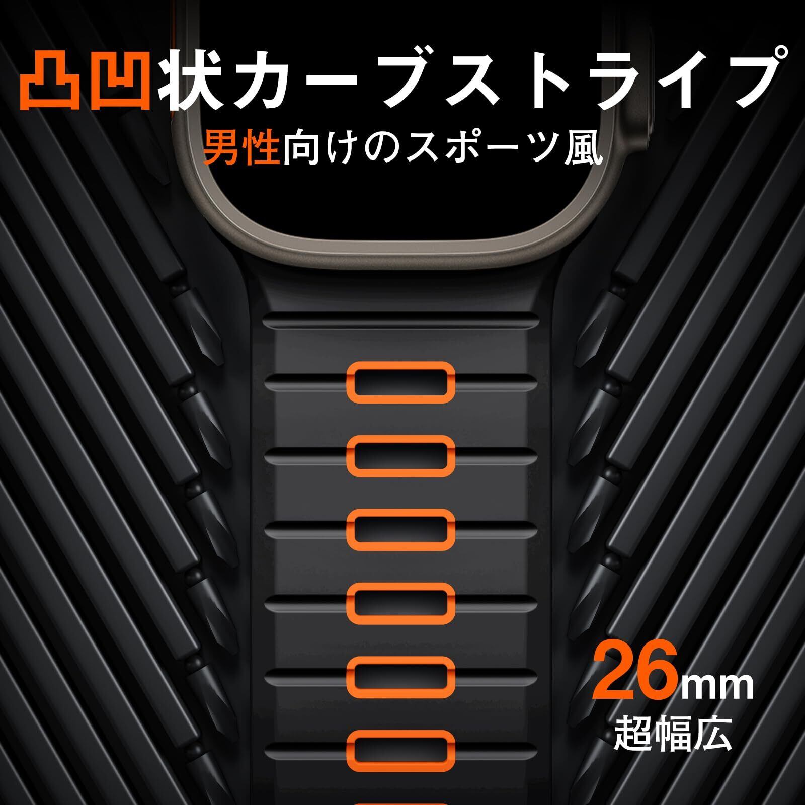 【独特なスポーツスタイル】Apple用 Watch Ultraや大画面のApple用 Watchに対応するようデザインされた、男性向けのアップルウォッチ用 バンド スポーツなスタイルを演出します。緩やかな凸凹状のカーブと通気孔が手首により多くの空間を提供し、通気性を向上させます。幅広い26mmのバンドは、スポーツやアウトドアのアクティブな雰囲気を演出します。また、手洗いやスポーツ中の汗から手首を保護します。