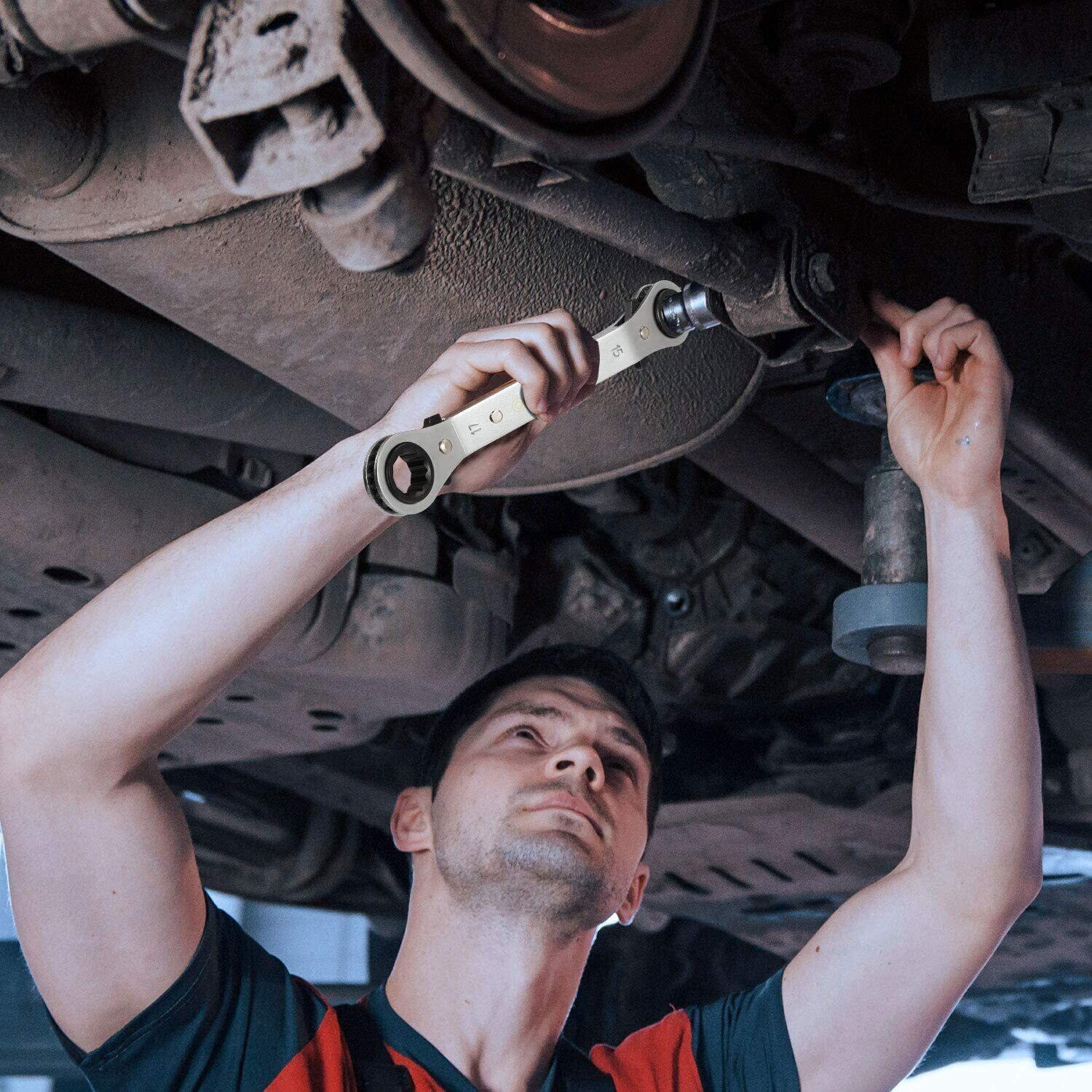 【高品質】可逆ラチェットレンチセットの材質は高品質CR-V鋼製、堅牢で耐久性に優れています。表面処理としてクロムメッキ及びブラスト処理を施して耐食性も抜群で高級感があります。本体は4本のリベットで固定され、外れないようにしっかり固定されています。交換可能ラチェットレンチは普通のレンチより重くて、使用時に更に安定して、トルクが更に大きいです。