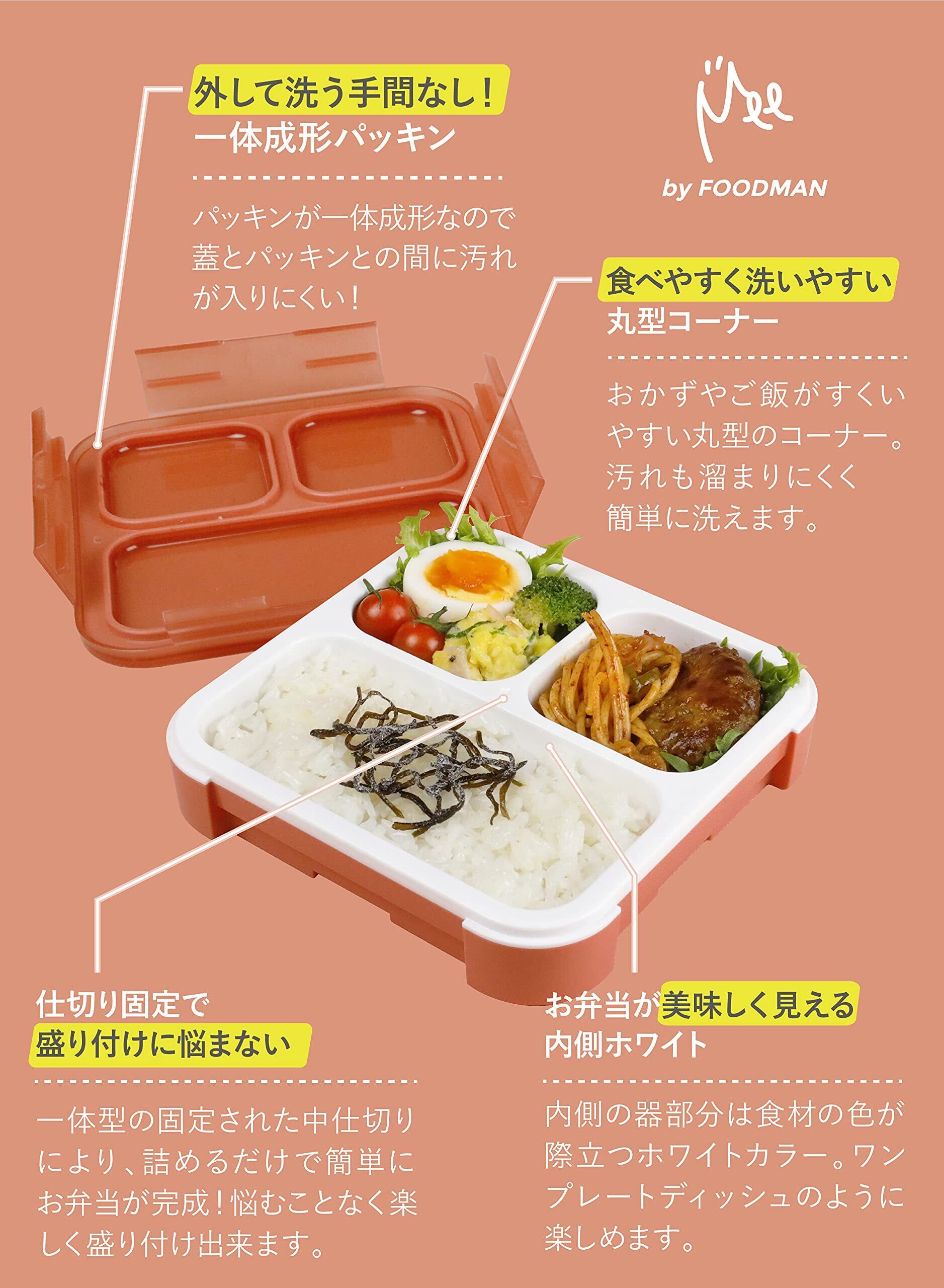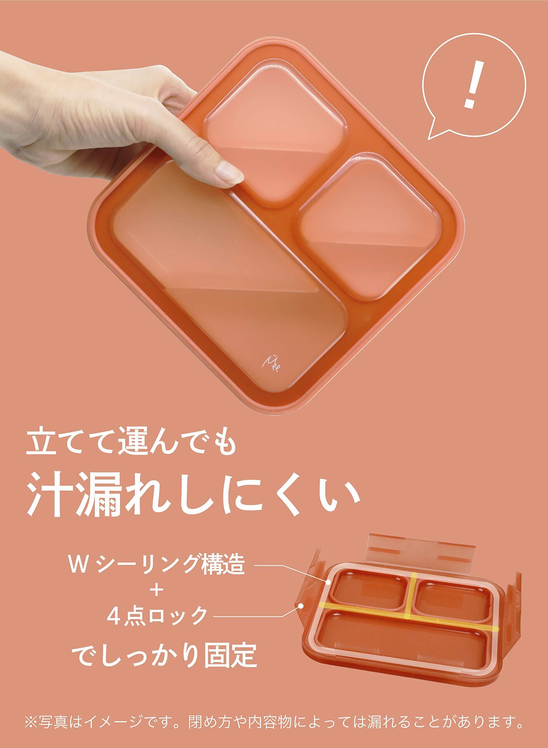 【汁漏れしにくい】一体型のパッキンと4点ロックで汁漏れを防止します! 本体の周囲と中仕切りをシーリングするWシーリング構造で、汁漏れを防止します。各スペースの汁移りも防ぐので、おかずなどの味移りも防止します。※本商品は密閉容器ではありませんので、水分の多い物や汁物は入れないでください。漏れの原因になります。