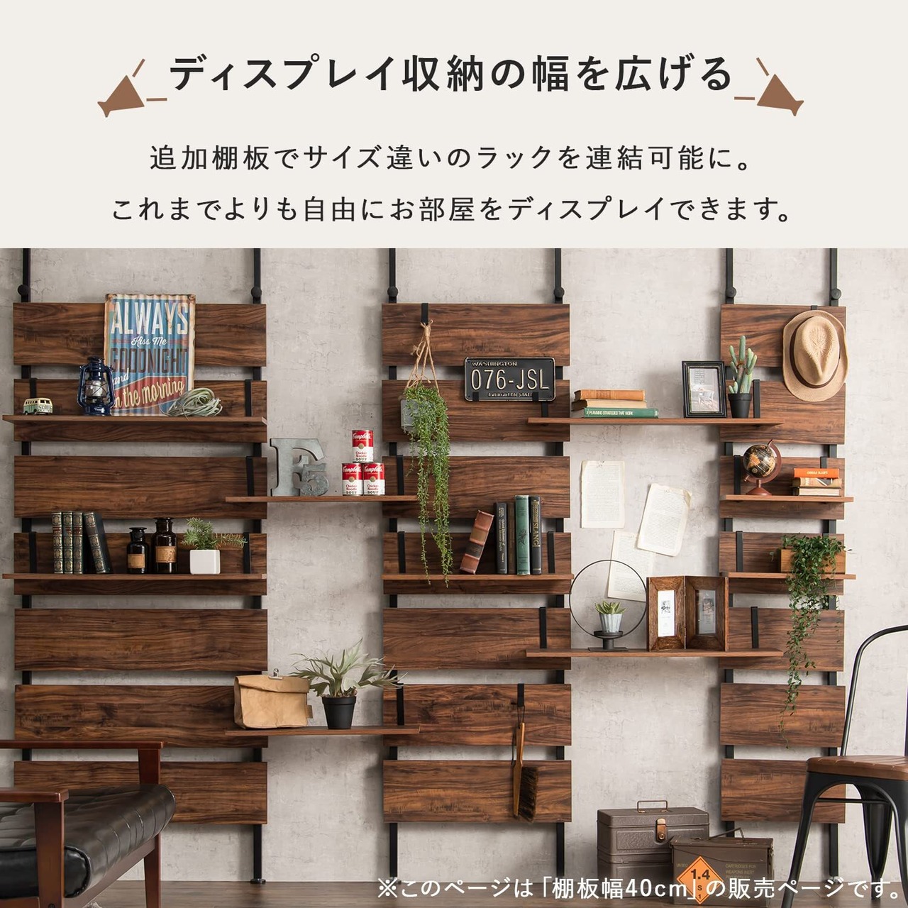 萩原(Hagihara) つっぱり ラック 追加棚 オプション ウォールラック 木目調 2枚セット 幅40 奥行17.5 高さ15 モダン シンプル ブラウン×ブラック KTR-3142-T40BB