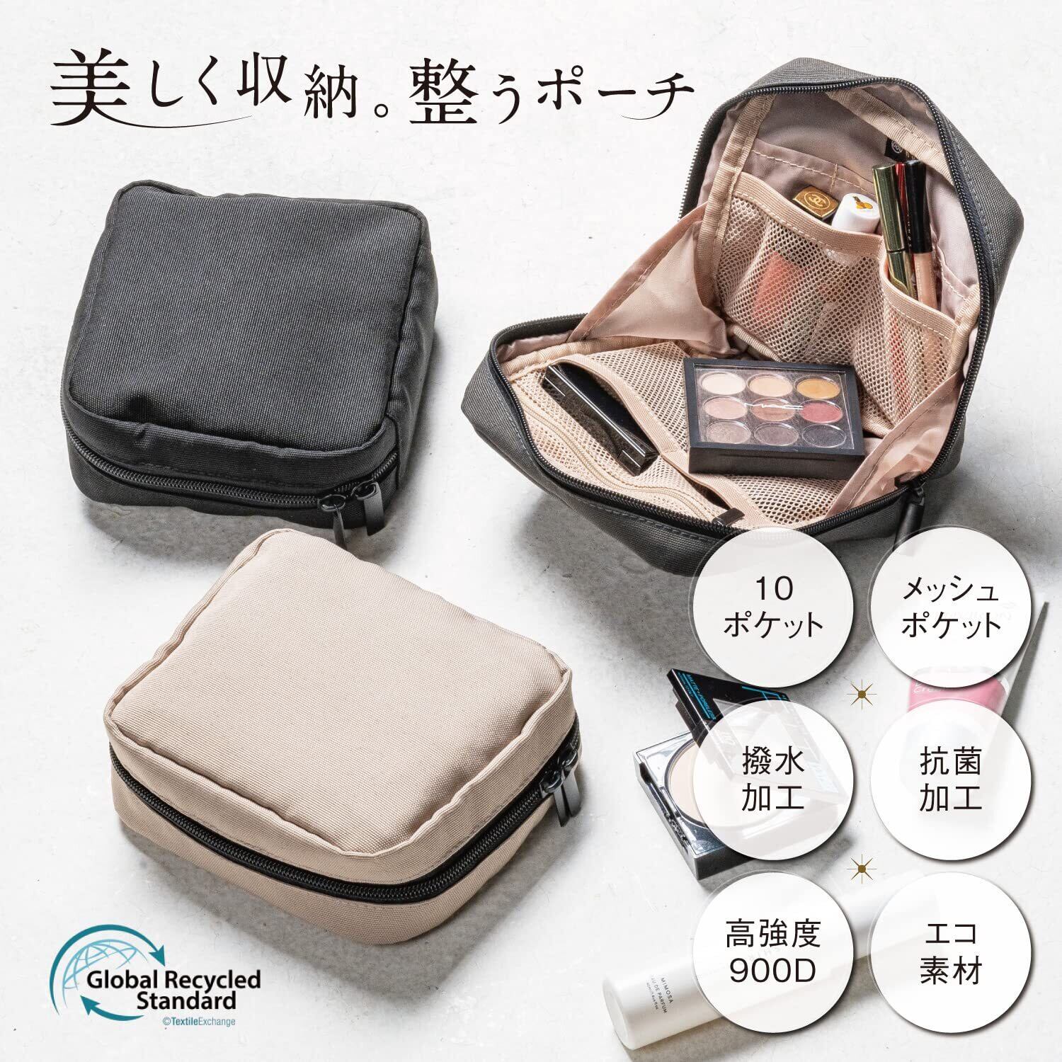 【耐久性抜群の素材】アウトドアバッグにも使わえれる耐久性をそなえた900Dの高密度、高強度素材を採用しております。【シンプルなデザインでシーンを選ばず使える】デザインは極力シンプルに使いやすく、マットブラックのファスナーで大人な雰囲気を印象づけます。内側ポケット×9(メインポケット1、メッシュポケット4、小ポケット3、メッシュファスナーポケット1) 外側ポケット×1 サイズ:約17cm×15cm×4.5cm 本体重量:96g 素材:R-PET(リサイクルポリエステル)