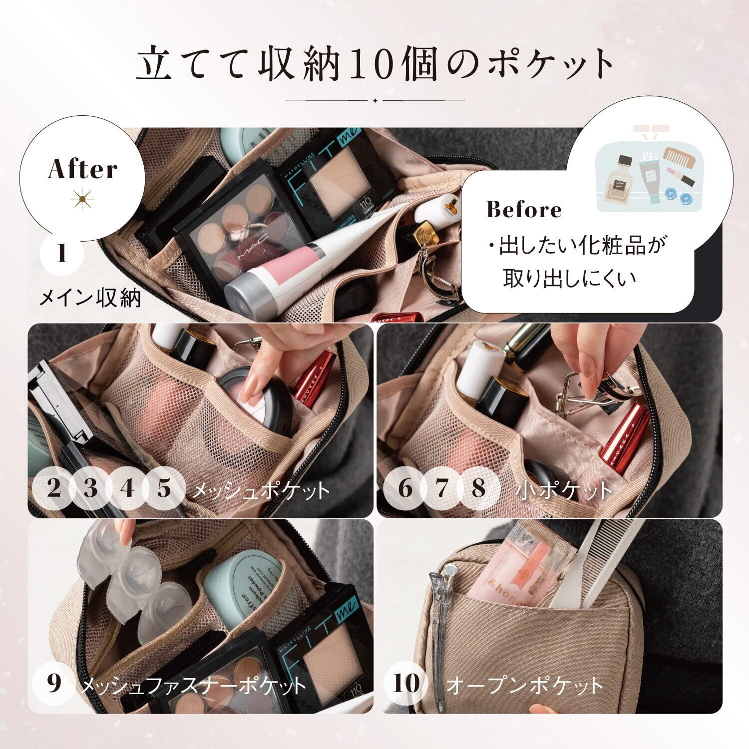 【中身が一目でわかるメッシュポケット】インナーポケットの大部分はメッシュポケットを採用。中身が一目でわかるのでどこにどんな化粧品を入れたのかが一目でわかりサッと取り出すことができます。 お気に入りのメイク道具が並ぶと満足度UP間違いなしメッシュポケットは手前に4箇所とファスナーでのメッシュポケットが1箇所のポケットがあります。