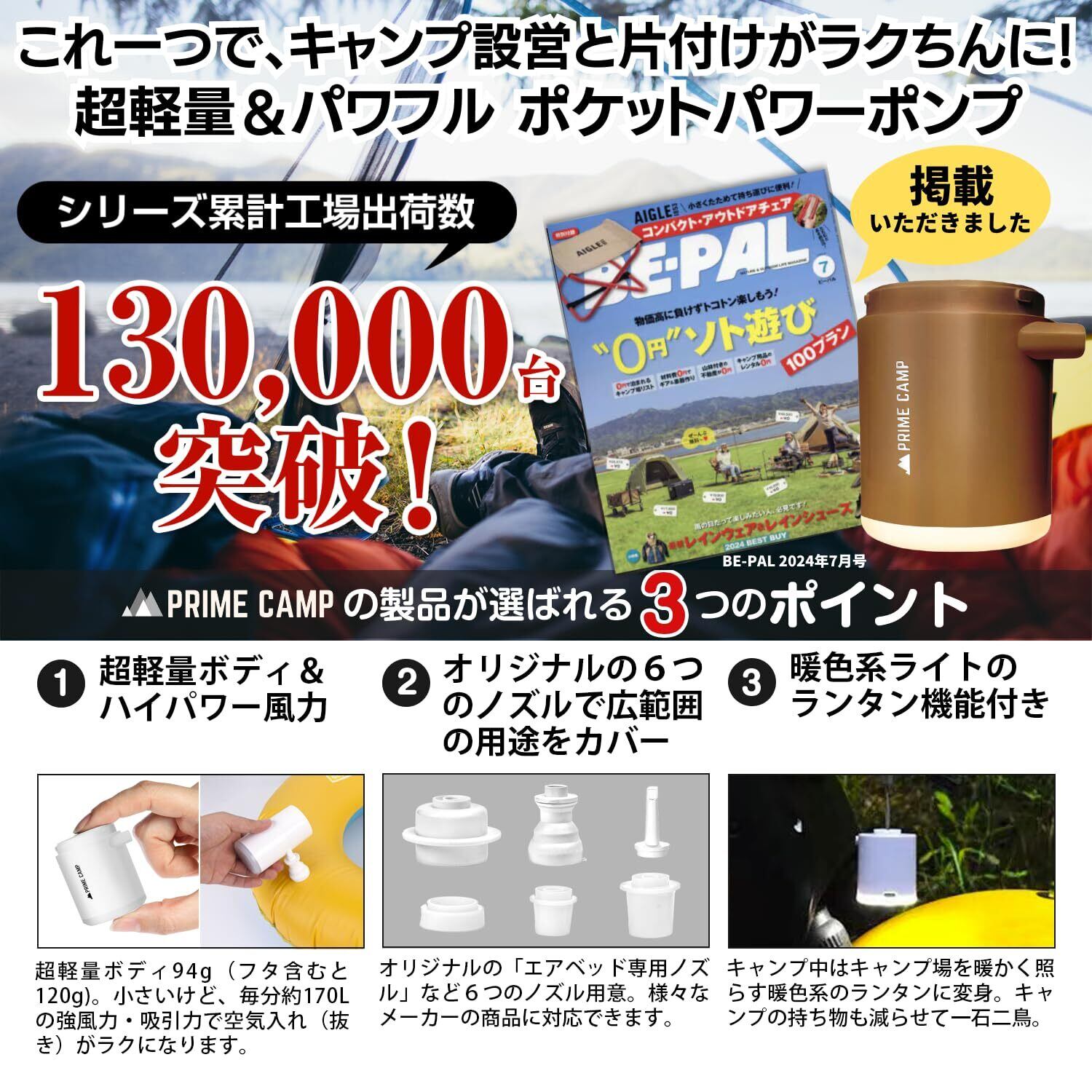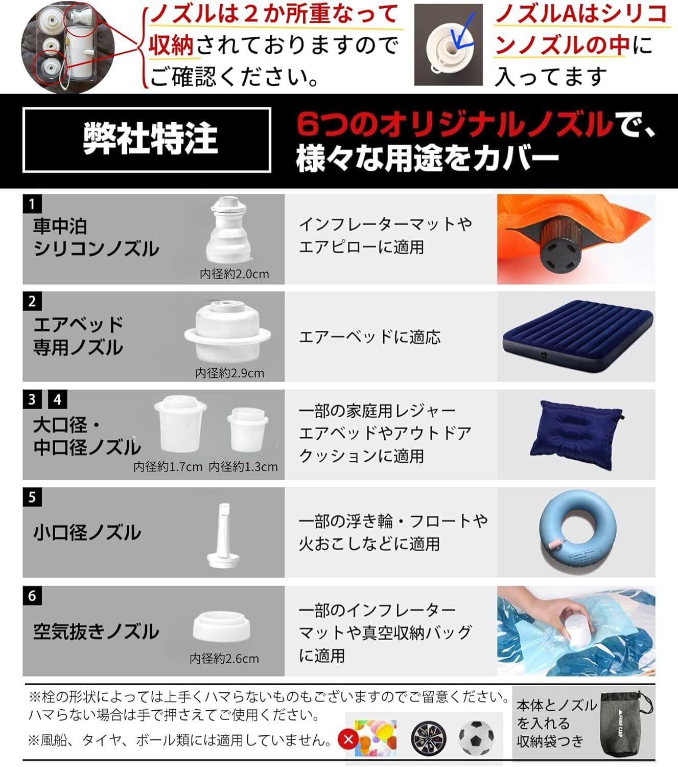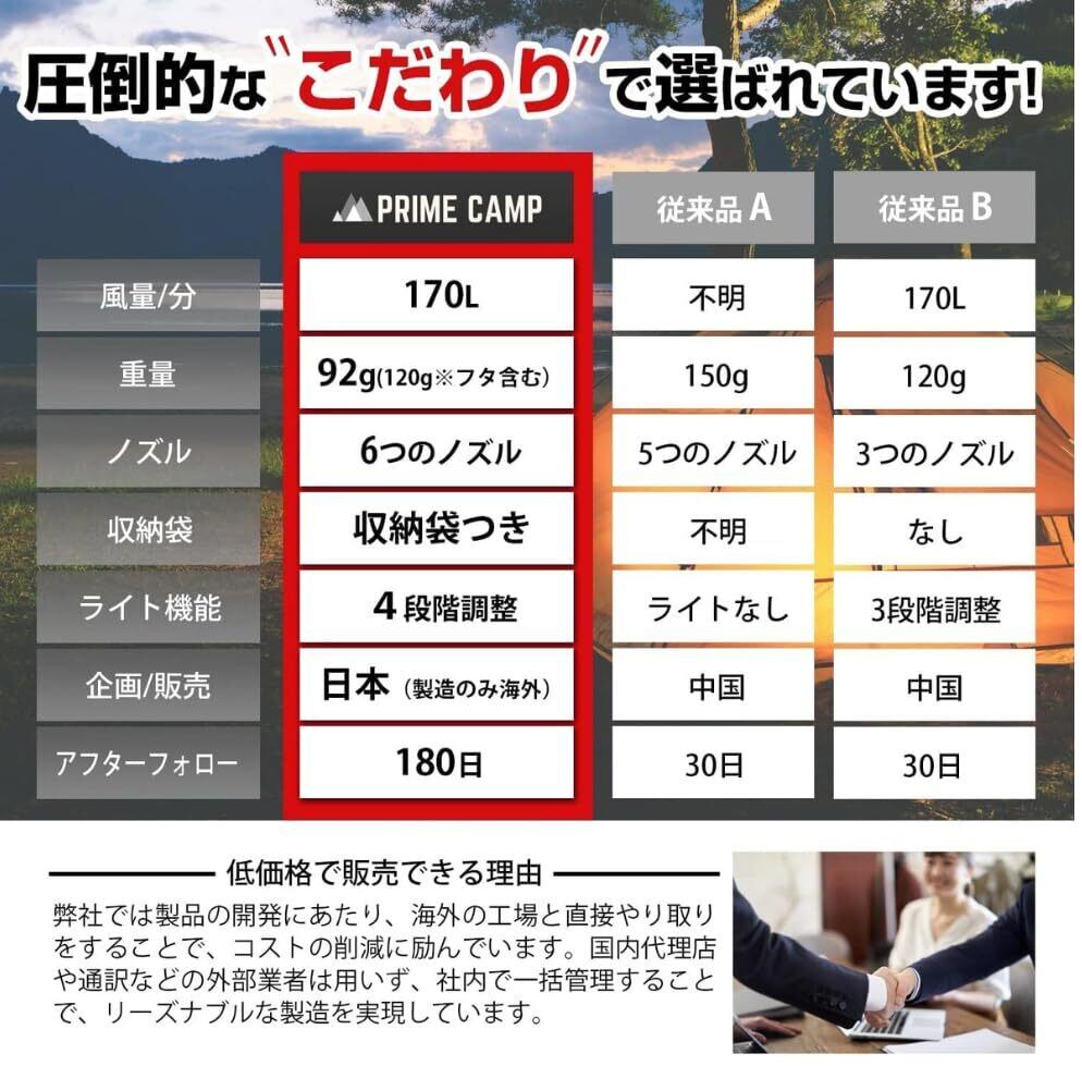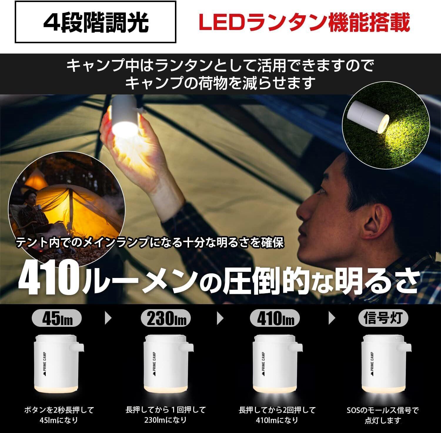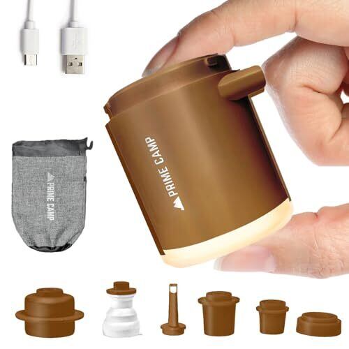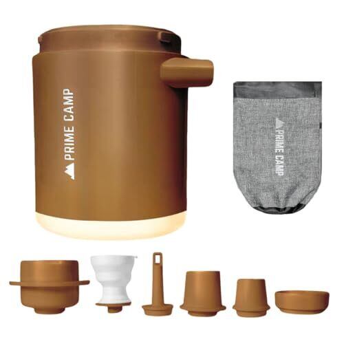 プライムキャンプ エアーポンプ 電動 空気入れ 超軽量 強力170L/分 【6つのノズル&ライト付】 エアポンプ 1360mAh大容量バッテリー USB充電式 空気抜き インフレーターマット キャンプ 浮き輪(コヨーテブラウン)