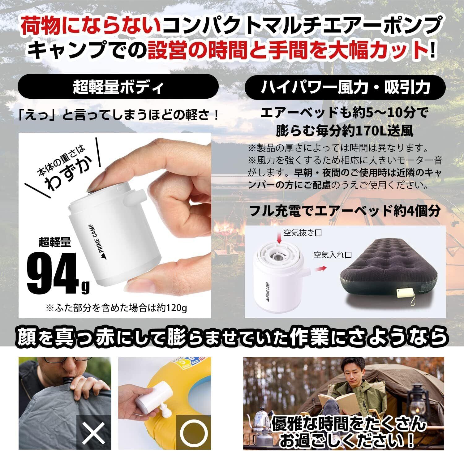 【超軽量&強力電動エアーポンプ】超軽量モデルの電動エアーポンプ。本体重量は約94g(フタ含む120g)。コンパクトだけど風密度170L/分と強力で、インフレーターマットなどの空気入れ/空気抜きをしっかりサポートします。 キャンプ、アウトドアでこれがあれば準備が楽ちんです。