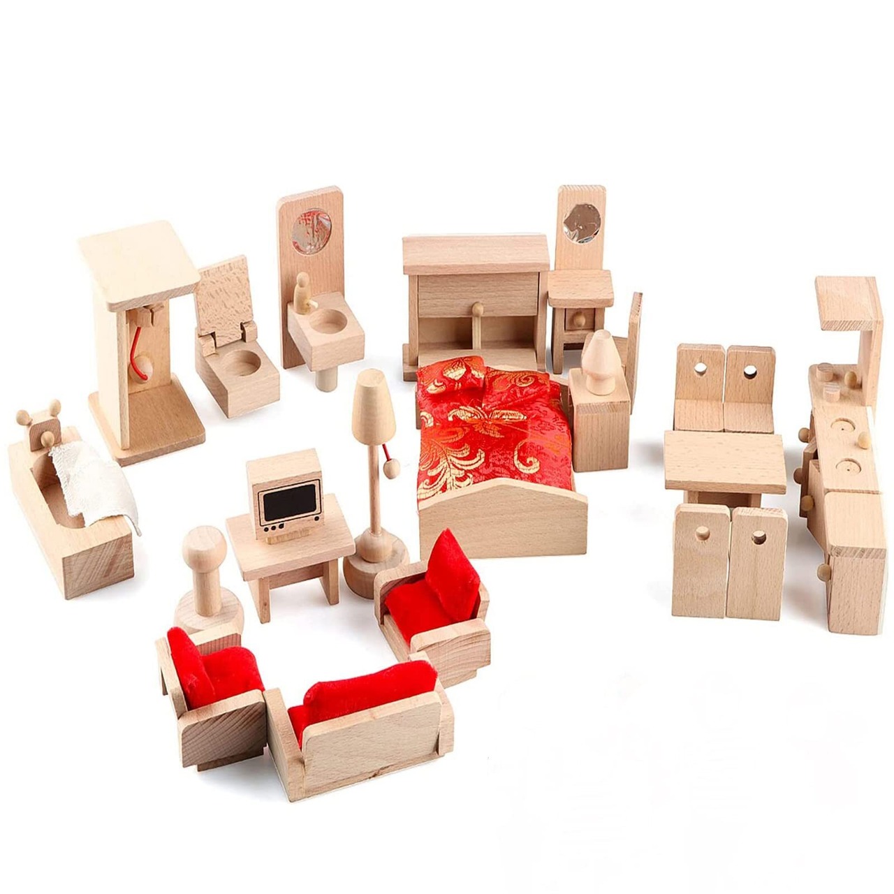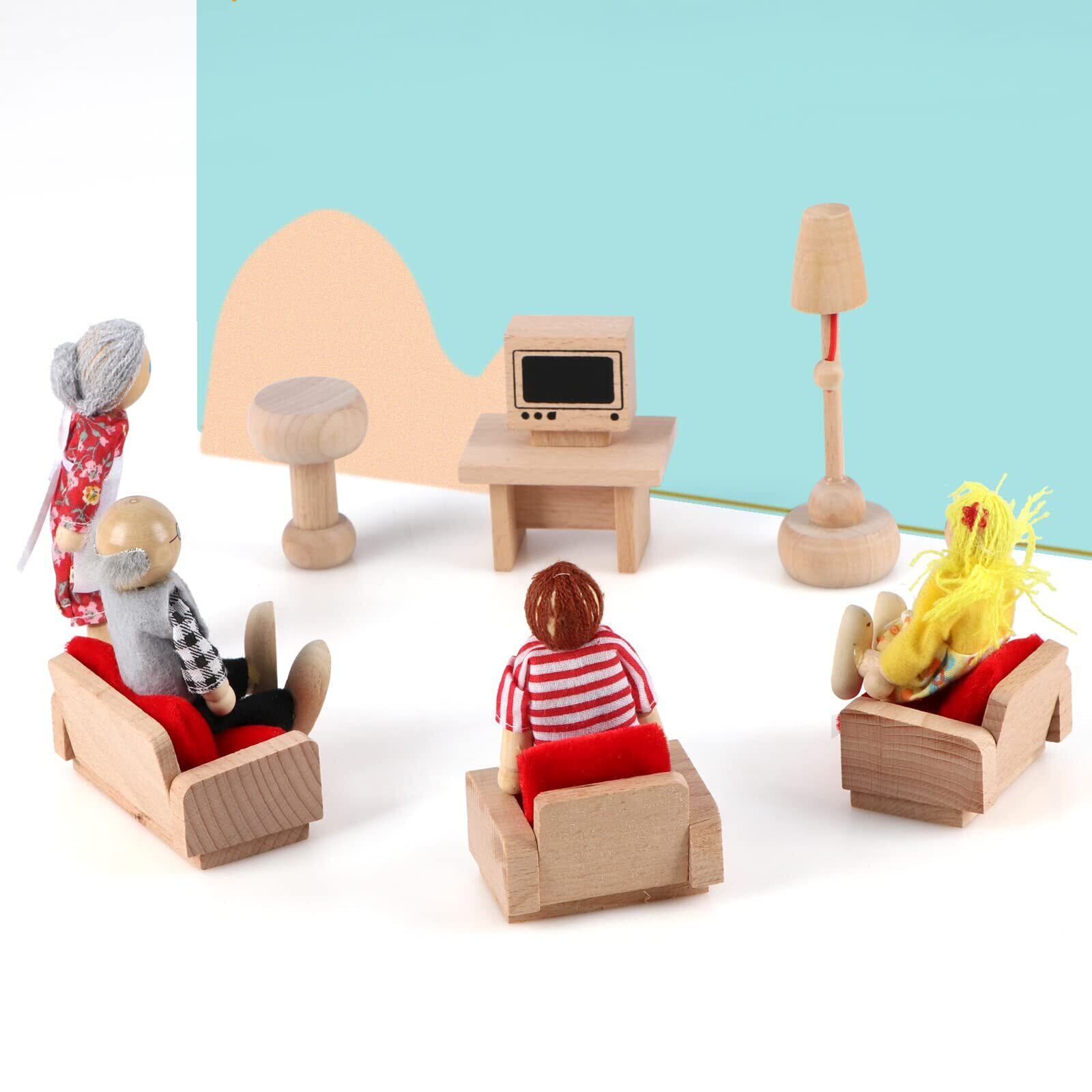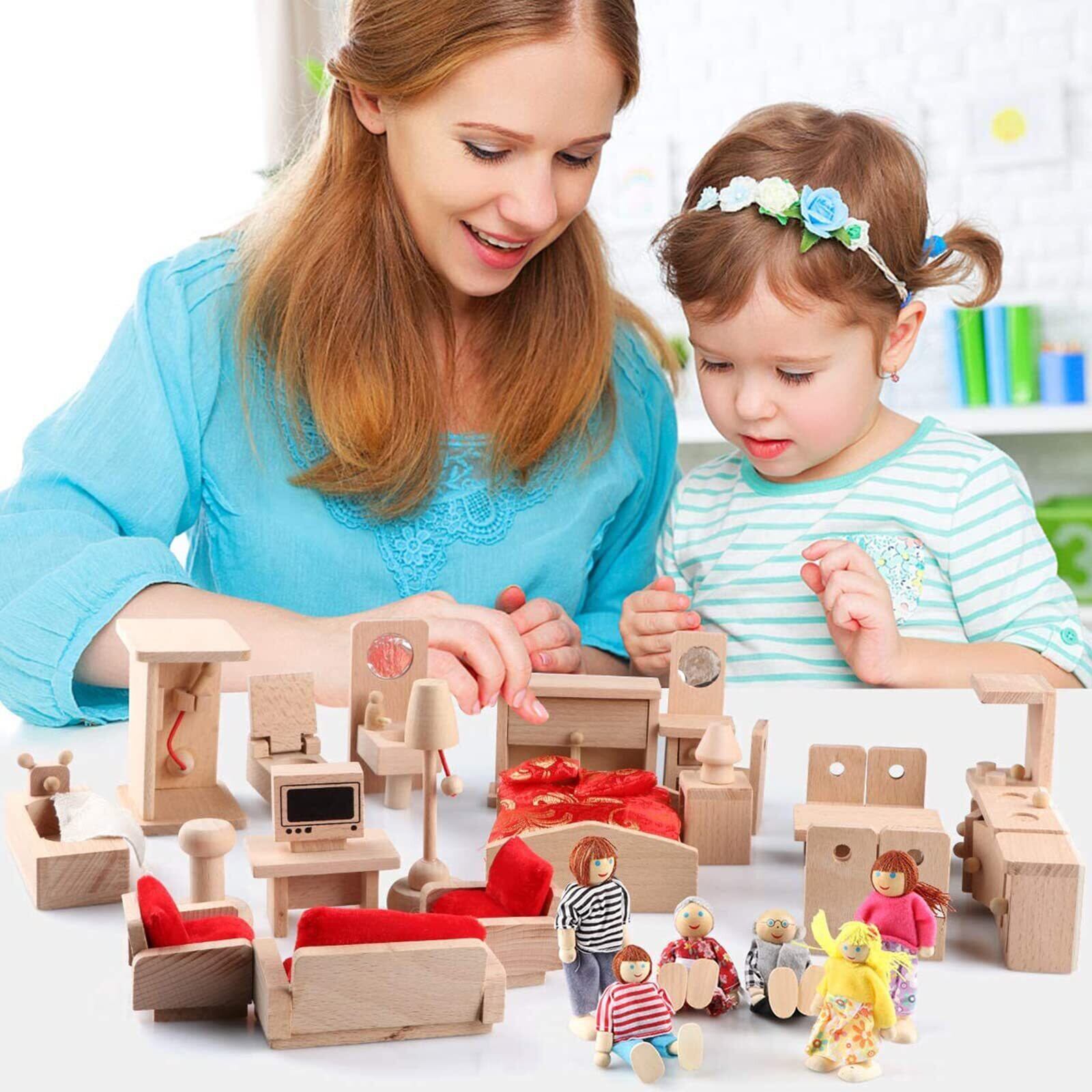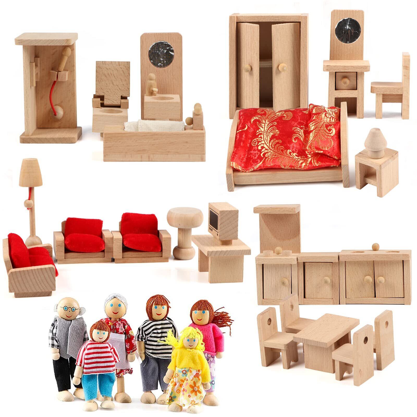 ドールハウス家具セット:バスルーム、リビング、ダイニング、寝室、キッチンと6人の家族人形を含む木製家具5セット。おもちゃ屋のゲーム用の木製家具は5セットあり、浴室、リビング、レストラン、寝室、キッチン、おもちゃ人形6個が含まれている。