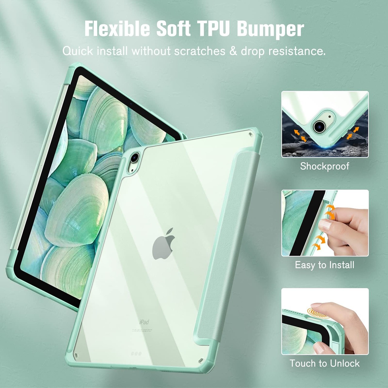 【材料・透明バックカバー】 ケースの表面はPUレザー素材を利用して、軽量、超薄を備えます。ポリカーボネート素材を採用している透明バックカバーは汚れや傷つけなどを防止するだけでなく、iPad本体の色と美しさも活かせます。透明バックカバーの枠は柔軟な TPUを採用して、取り付けも簡単にできます。フロントカバー内部材質はマイクロファイバーで、摩擦によって発生する傷を抑え、液晶画面を保護しきれいに保ちます。(ご注意:透明バックカバーには保護用のフィルムがついていますので、ご使用前に保護フィルムを剥がしてください。)