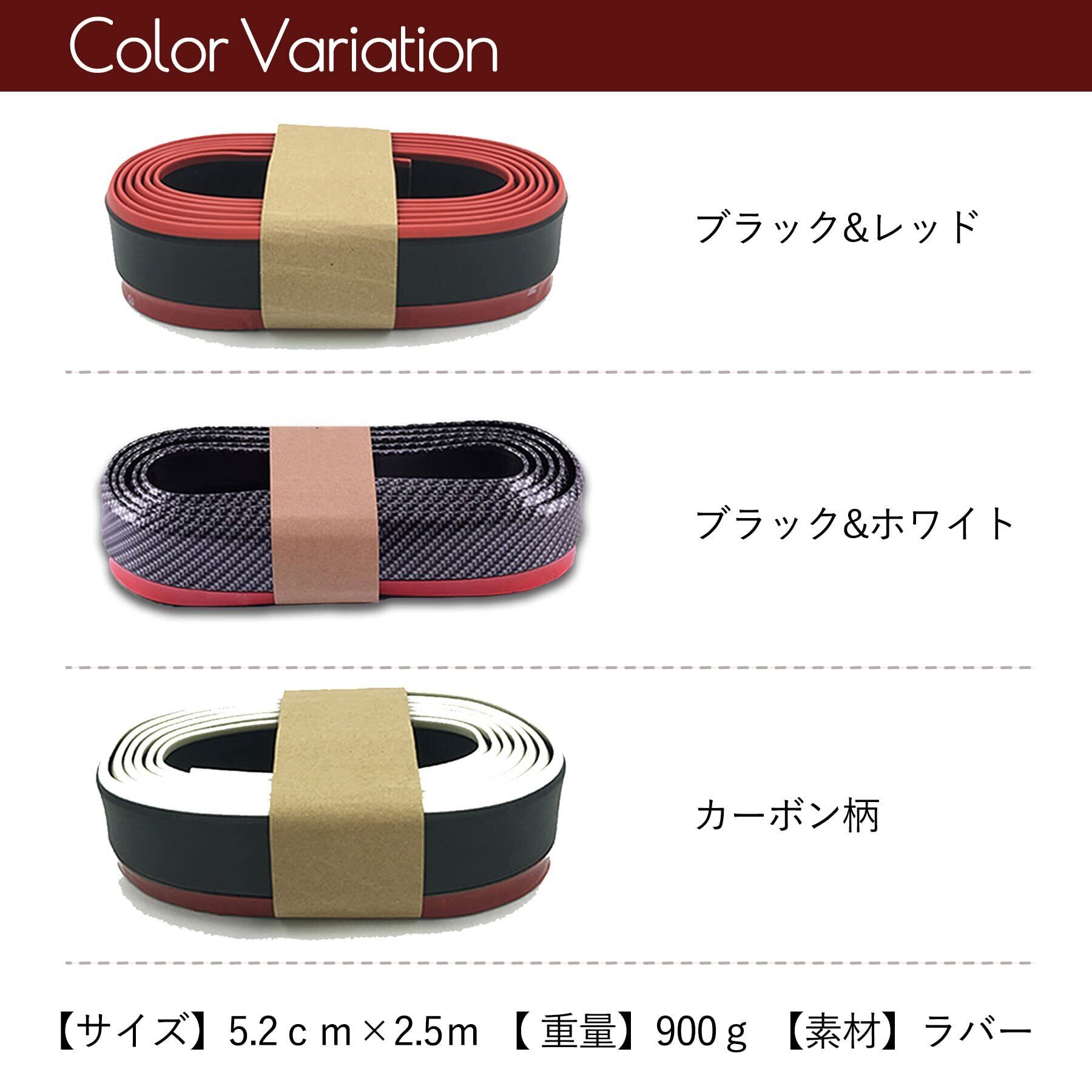 耐久性のある素材を使用しており、長期間の使用にも耐える設計となっています。フェンダーやサイドシル、バンパー下部など、さまざまな場所に装着できるため、用途に応じたカスタマイズが可能です。ブラック&レッド、ブラック&ホワイト、カーボン柄の3種類のバリエーションからお選びいただけます。