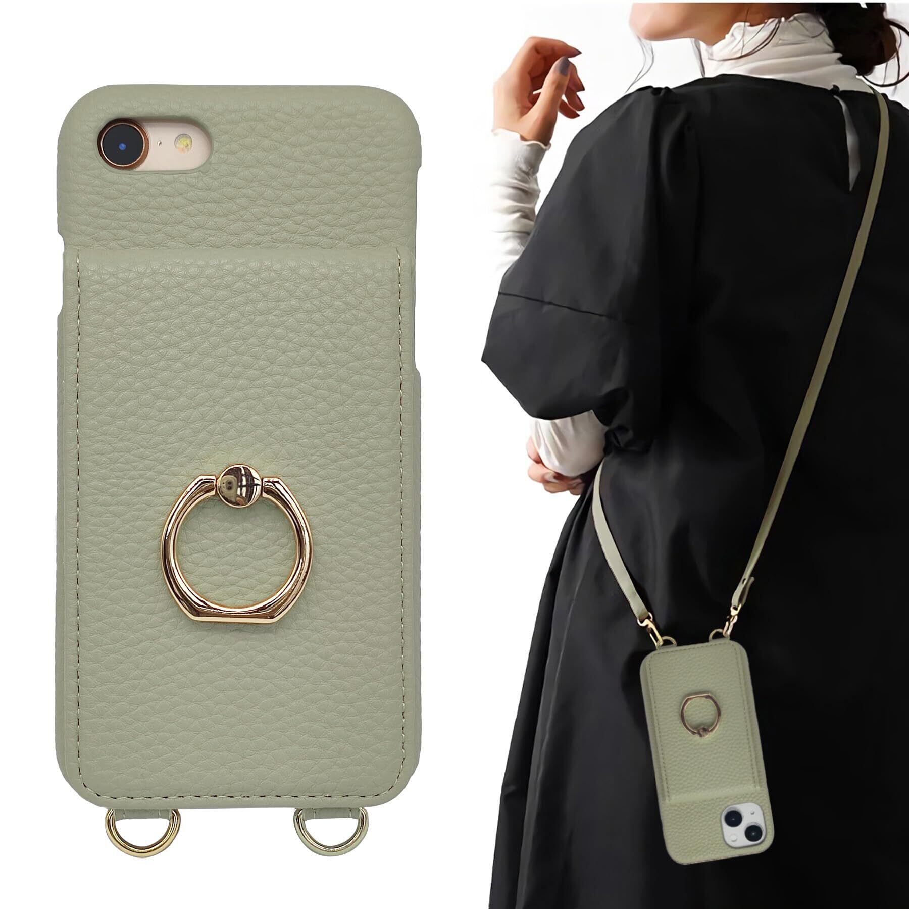 スマホケース iPhone se ショルダー カード収納 背面手帳型 リング付 スマホケース iPhone se ケース ショルダー ストラップ付き スマホケース se ショルダー 落下防止 肩掛け 斜め掛 首掛け 可愛 かわいい おしゃれ スタンド機能 iPhone8 7 se2 se3 第3世代 ケース ショルダー ピーグリーン