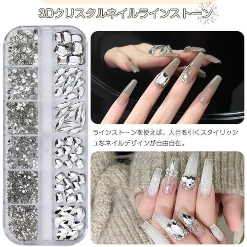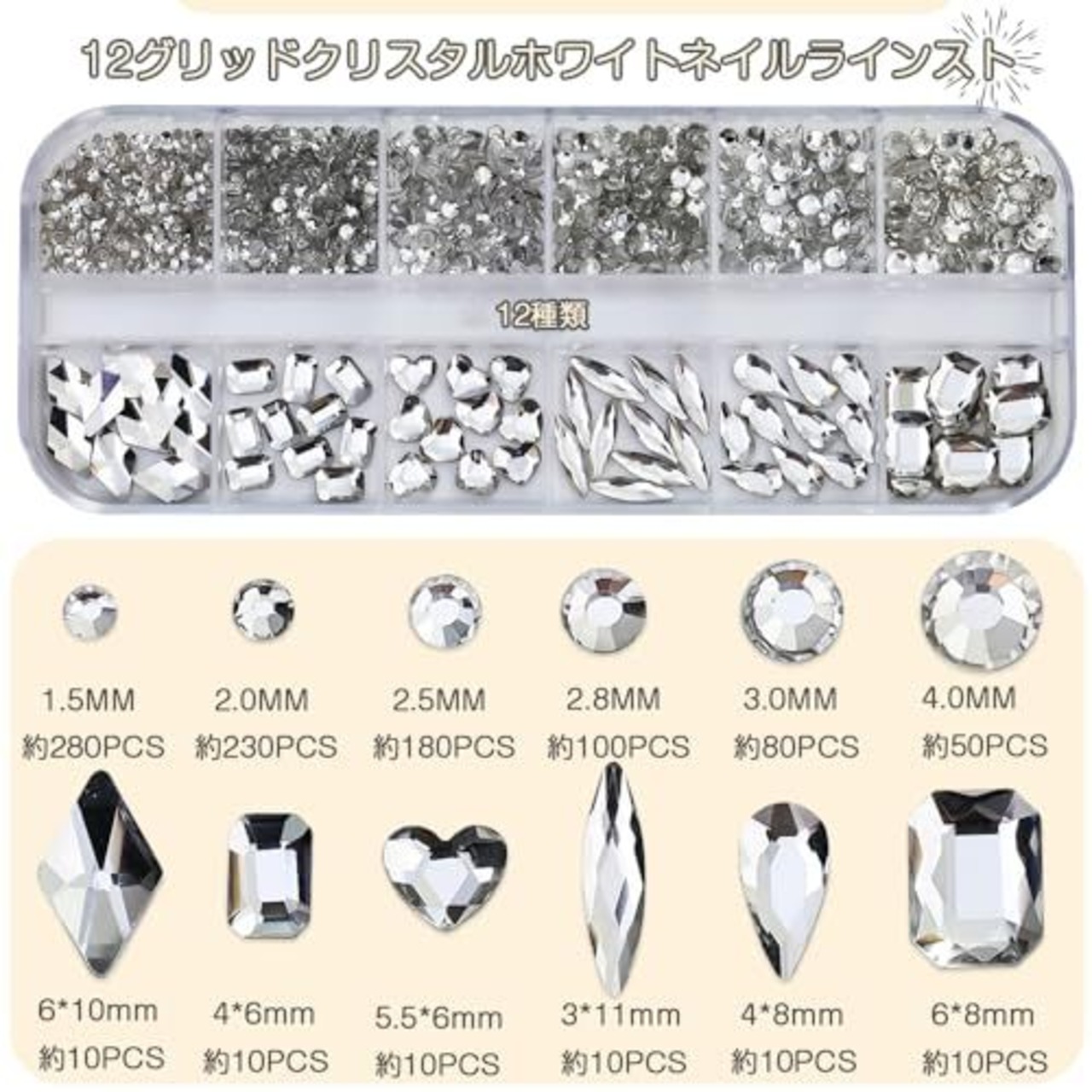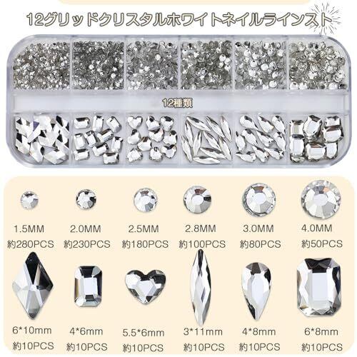 セット内容:ネイルパーツ約980粒セット;カラー:ホワイト;1箱に12個の正方形が入っており、それぞれの正方形は異なる形と大きさのネイルパーツ。立体的で存在感抜群なので、ネイルの装飾に最適です。