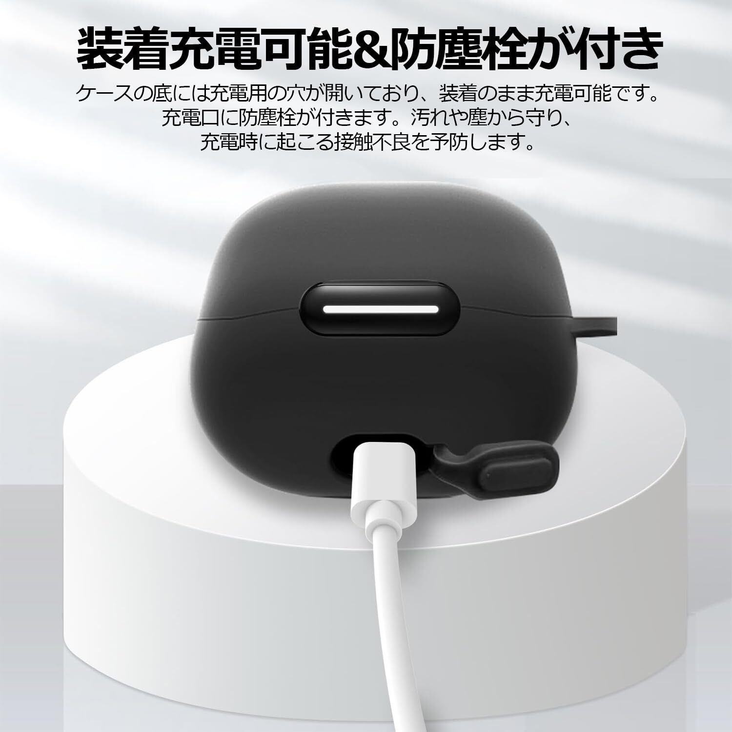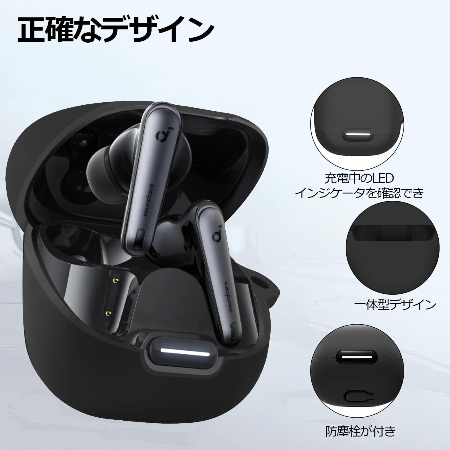 「充電らくらく&防塵栓が付き」ケースに充電用の穴が空いているので、手間なくケーブルを挿し込めて、装着したままの充電が可能です。さらに、Soundcore liberty 4 ncの充電口に防塵栓が付きます。汚れや塵から守り、充電時に起こる接触不良を予防します。