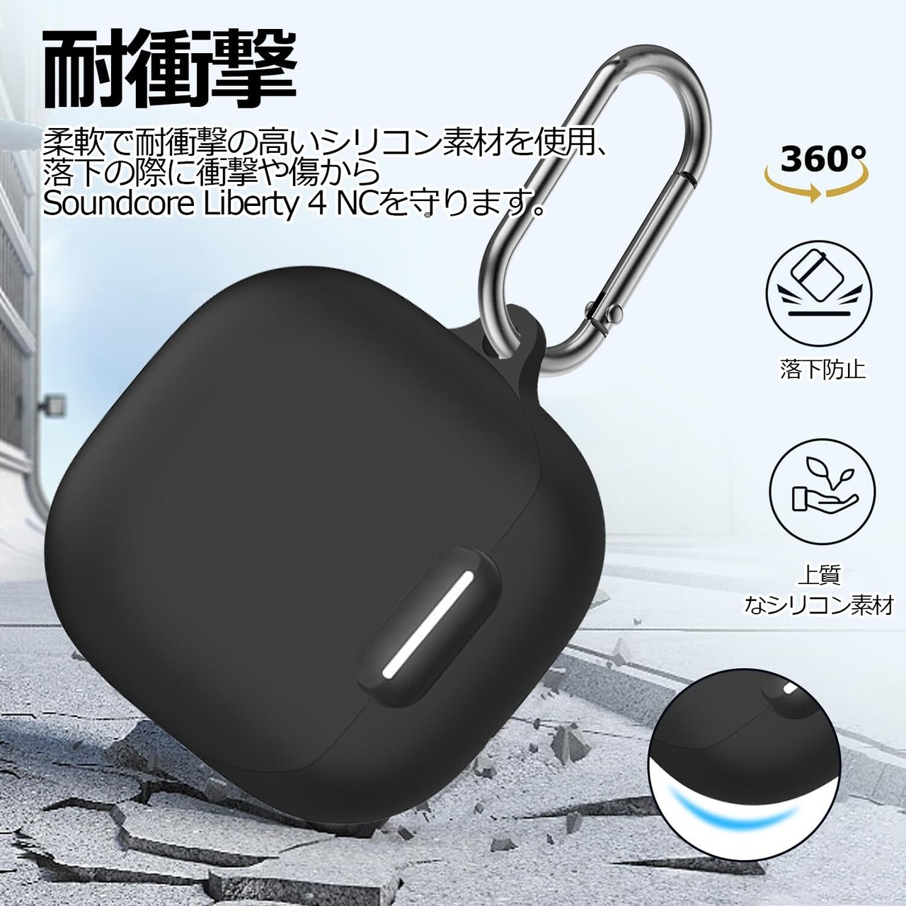 「360°フルシリコン製Anker Soundcore liberty 4 nc 用保護ケース」柔軟で耐衝撃の高いシリコン素材を使用、落下の際に衝撃や傷からAnker Soundcore liberty 4 ncを守ります。また、柔らかくて滑りにくいため、グリップ感が上がり、落下防止にも役立ちます。