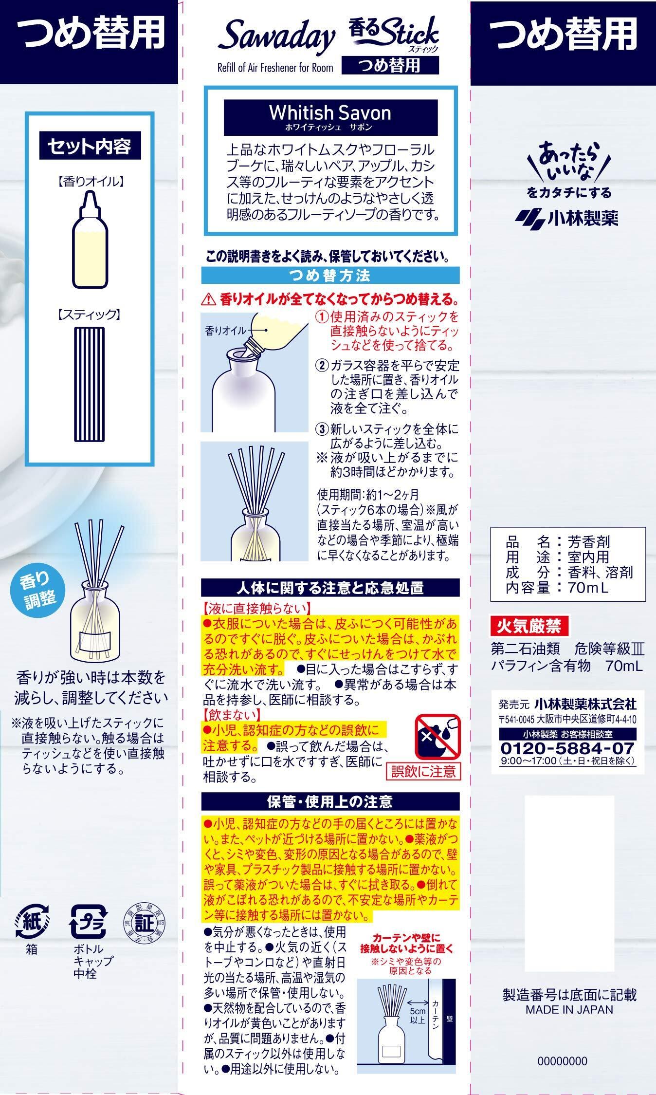 【まとめ買い】サワデー香るスティック SAVON つめ替用 ホワイティッシュサボン 70ml×3個(おまけ付き)部屋用 【 部屋 玄関 に映える ディフューザー 】