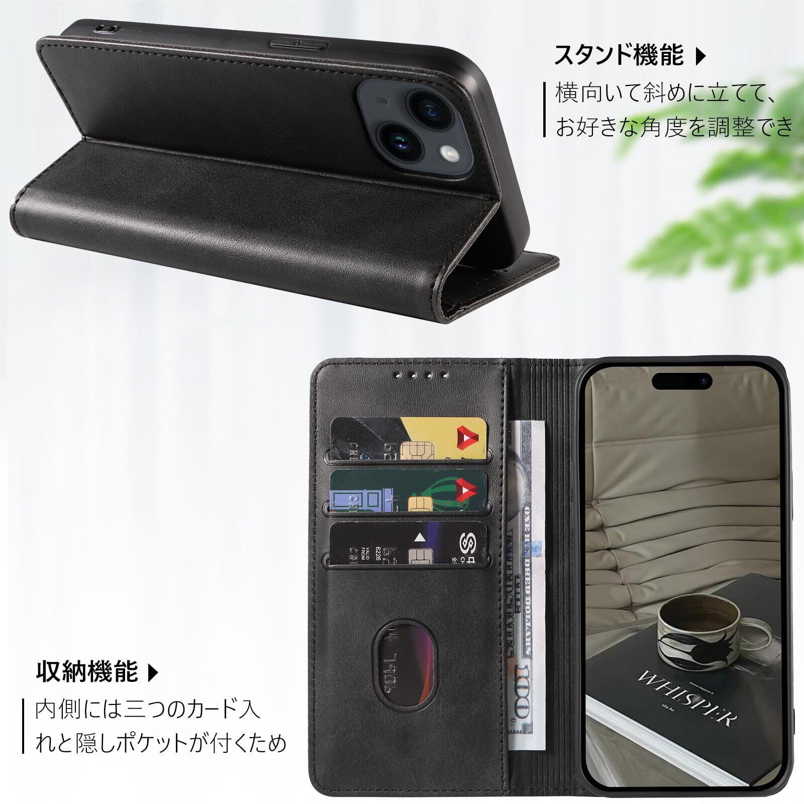 【KWATUNG】iphone 15 ケース 手帳型 レザー アイフォン15ケース 手帳型 軽量 薄型 マグネット式 iphone15ケース手帳型 カード収納 スタンド機能 iphone 15 手帳型 ケース 衝撃吸収 落ち着いた色 iphone 15 スマホケース アイフォン15手帳型ケース 放熱性 折りたたみ 6.1インチ【ブラック】